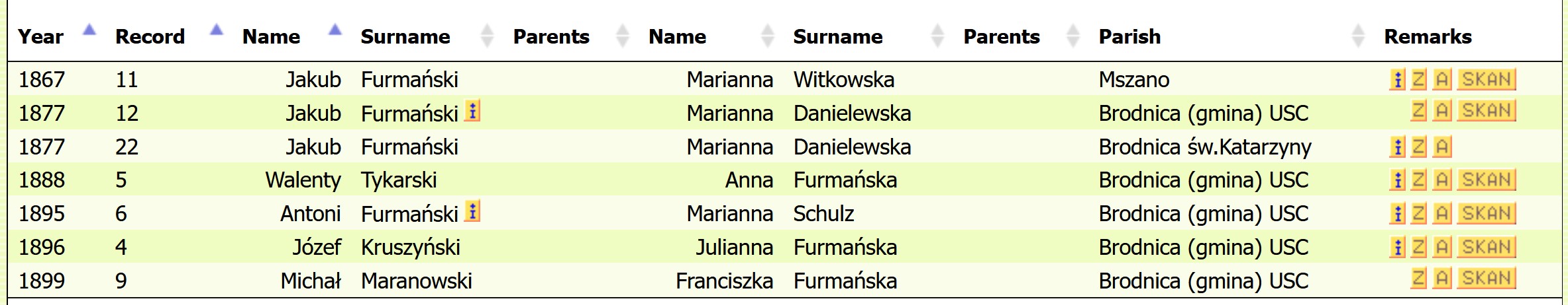 The Polish indexing website Geneteka lists the marriages of the Furmański family in Mszano and Brodnica.