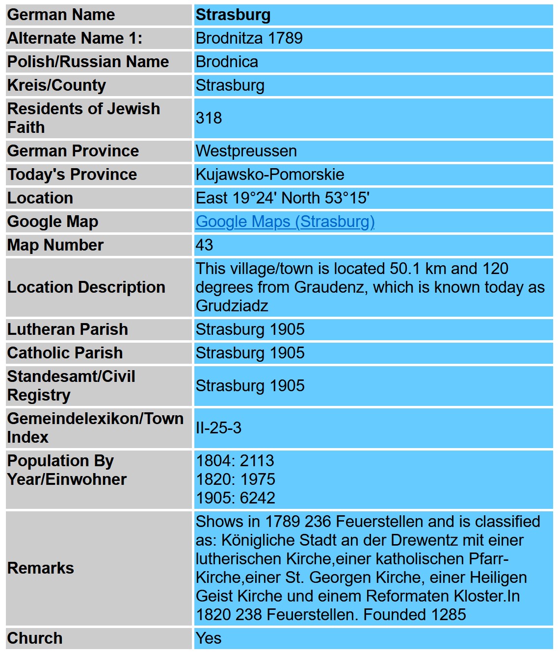 My father’s paternal ancestors were from the Brodnica area of West Prussia, which was called Strasburg when under German occupation in the 1800s. The database Kartenmeister shows that Strasburg was both a place and the name of the kreis, similar to a county. The Strasburg kreis included other towns and villages, and it was the Standesamt, or Civil Registry, for many local records.