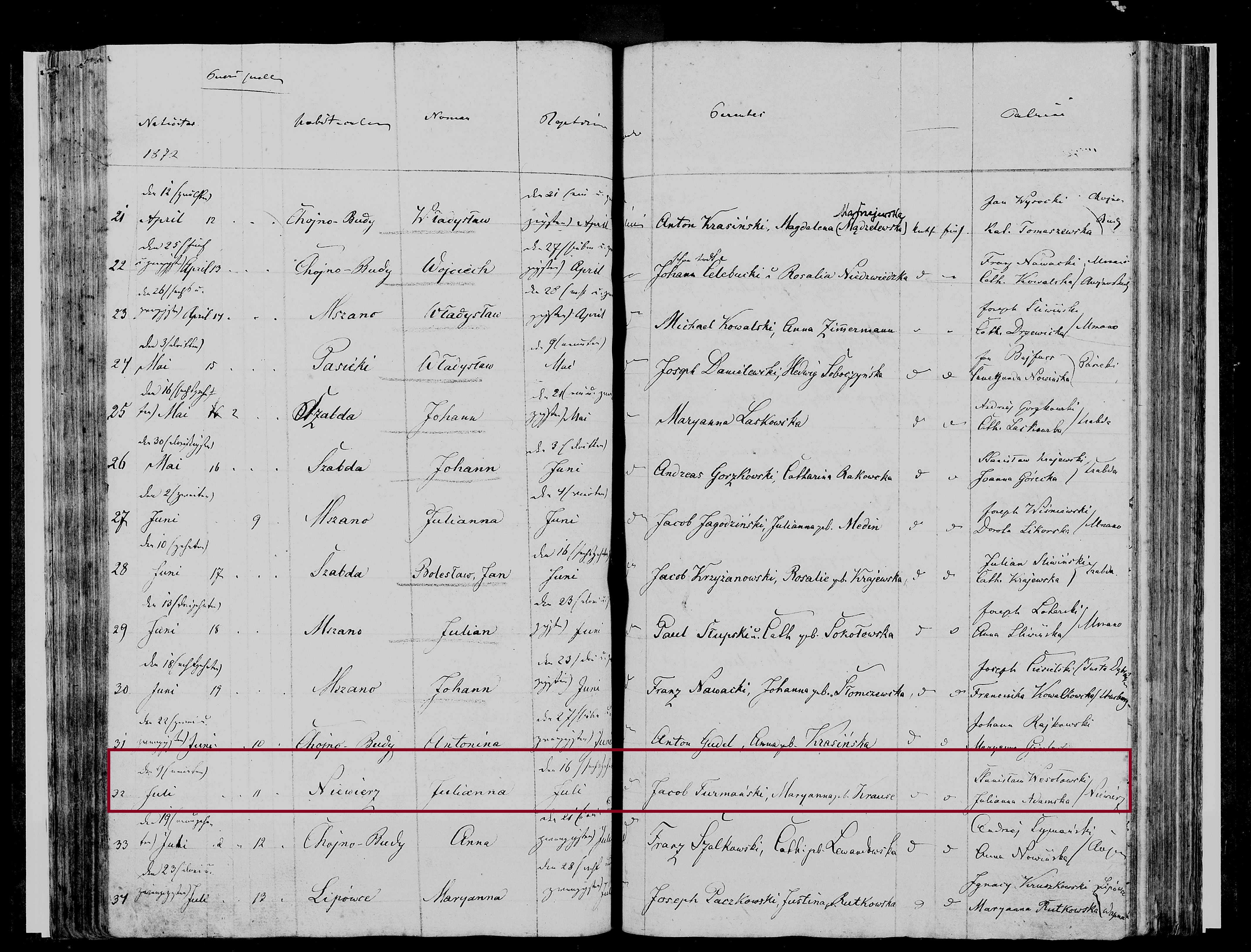 Julianna Furmańska, daughter of Jakub Furmański and Marianna Krause, was born in Niewierz and baptized in Mszanno, Strasburg, Westpreußen, Preußen, in 1872.