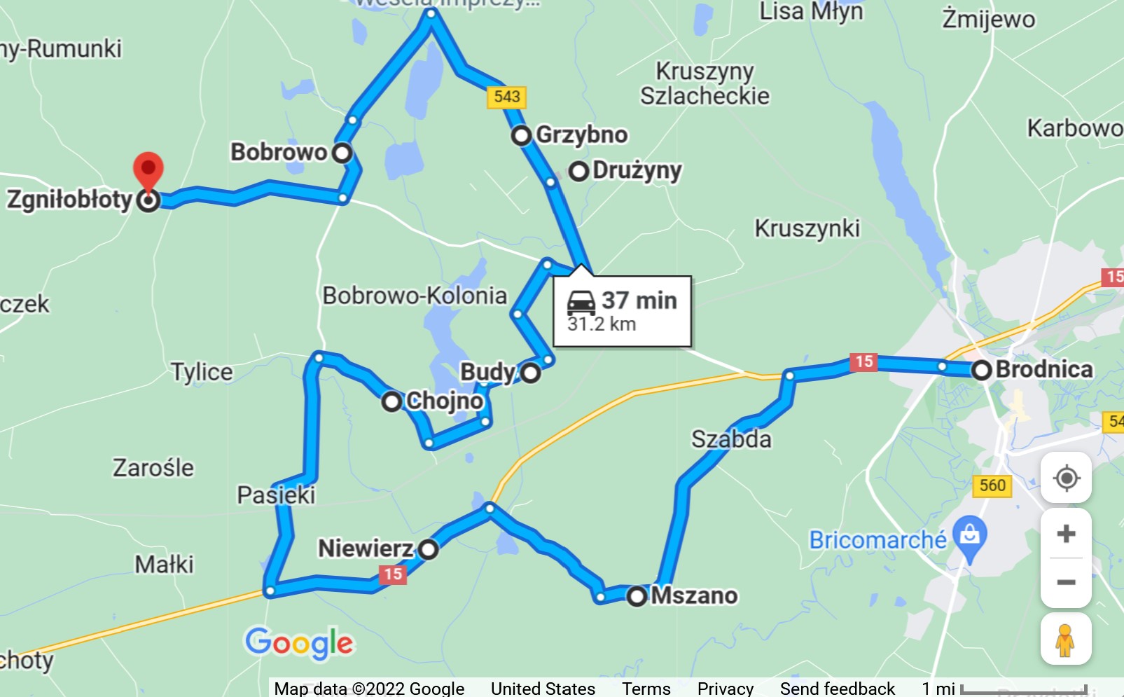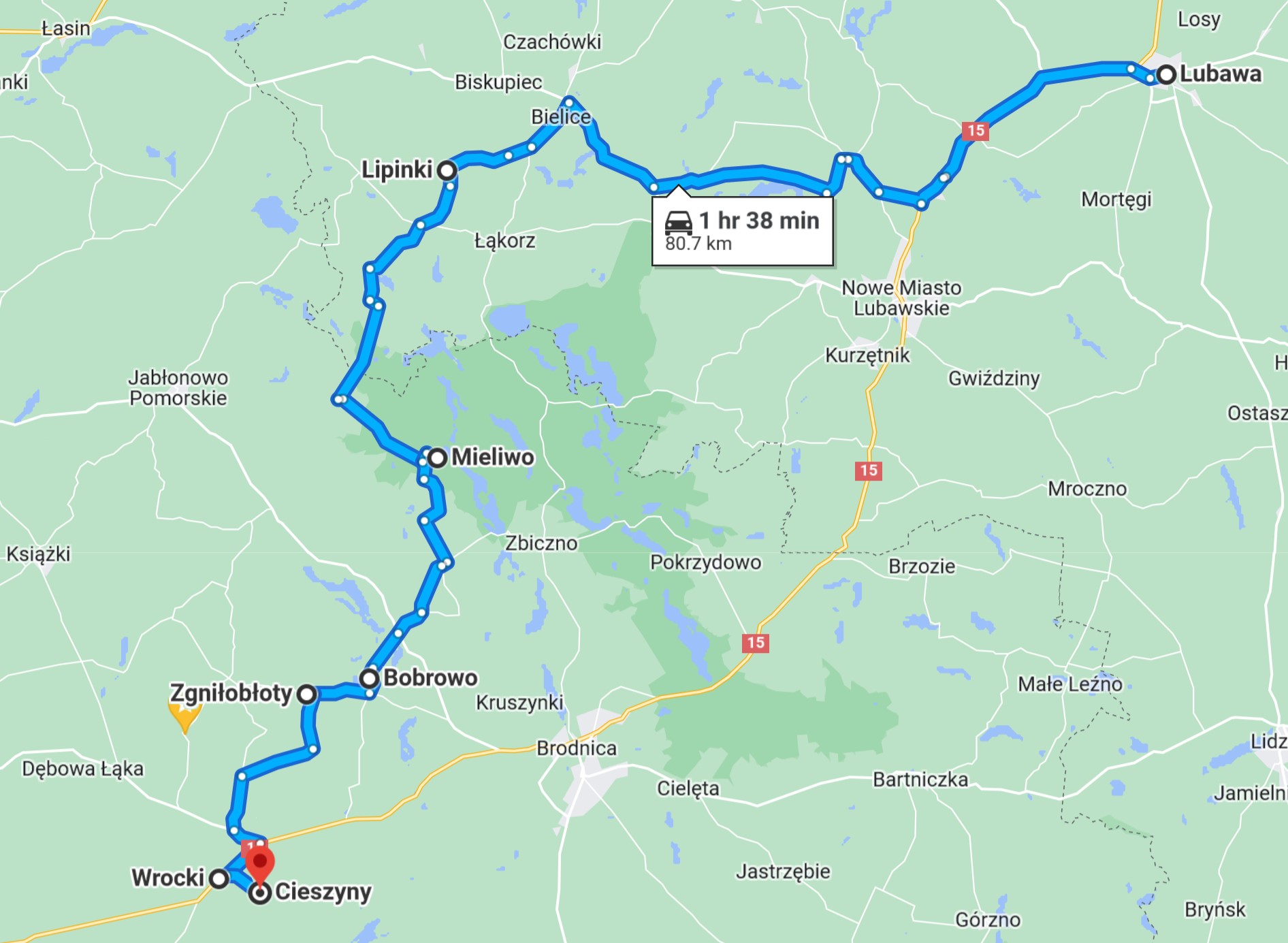 - Lubawa to Cieszyny Google map: https://www.google.com/maps/dir/Lubawa,+Poland/Lipinki,+Poland/Mieliwo,+Poland/Bobrowo,+Poland/87-326+Zgni%C5%82ob%C5%82oty,+Poland/Wrocki,+Poland/Cieszyny,+Poland/@53.3305058,19.3137207,10.42z/data=!4m44!4m43!1m5!1m1!1s0x471d6ccfda397b25:0x672b1df01ee466f7!2m2!1d19.7520301!2d53.50316!1m5!1m1!1s0x471d3a2ea034e673:0x8b2203e19e09eb71!2m2!1d19.3170308!2d53.4686699!1m5!1m1!1s0x471d24a19861e161:0x20bf1d6ae1e23c23!2m2!1d19.3114412!2d53.3649853!1m5!1m1!1s0x471d214bdeafc0c7:0xee69c6500a03bd24!2m2!1d19.2704357!2d53.285457!1m5!1m1!1s0x471d26c47951975b:0xc0b17996f667c852!2m2!1d19.2324493!2d53.2799066!1m5!1m1!1s0x471cd8bc2aff5a2f:0x946998bc7a59f834!2m2!1d19.1792842!2d53.2130343!1m5!1m1!1s0x471cd8b4a3418e81:0x971bd20c47f7d706!2m2!1d19.2041603!2d53.2081068!3e0