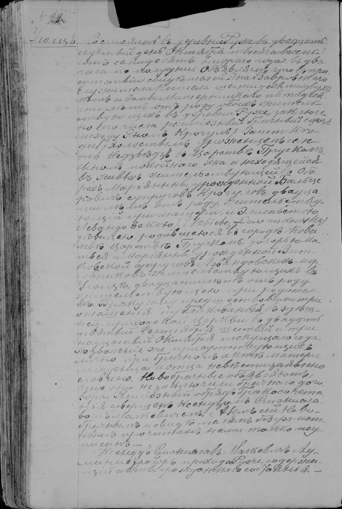 Took place in the village Ruże on October 27th, 1872 at 2 o’clock in the afternoon. We announce that today, in the presence of witnesses Jan Wawrowski, 62 years old, and Tomasz Maternicki, 50 years old, both living in the village Ruże, a religious marriage union was concluded between Jan Krogul, bachelor, 20 years old, son of Jan, already deceased, and Marianna, nee Balcerowicz, married couple Krogul, born in the village Niedźwiedź of Kingdom of Prussia and living with mother in the village Obory <gmina Zbójno>, and Elzbieta Lewandowska, maiden, 20 years old, born in the town Kowalew of Kingdom of Prussia and living with parents in the village Ugoszcz <Gmina Brzuze, Rypin County>, daughter of Mateusz and Marianna nee Witkowska, married couple Lewandowski. This marriage was preceded by three marriage banns in the parish of Ruże church on September 29th and October 6th, 13th of the current year. The newlyweds stated that they did not conclude a prenuptial agreement. Permission for the wedding was given to the bride by her father and to the groom by his mother, who were present here, verbally. The religious wedding ceremony performed by priest Stanislaw Malkiewicz. This act was read aloud to the illiterate present and then signed only by Us.