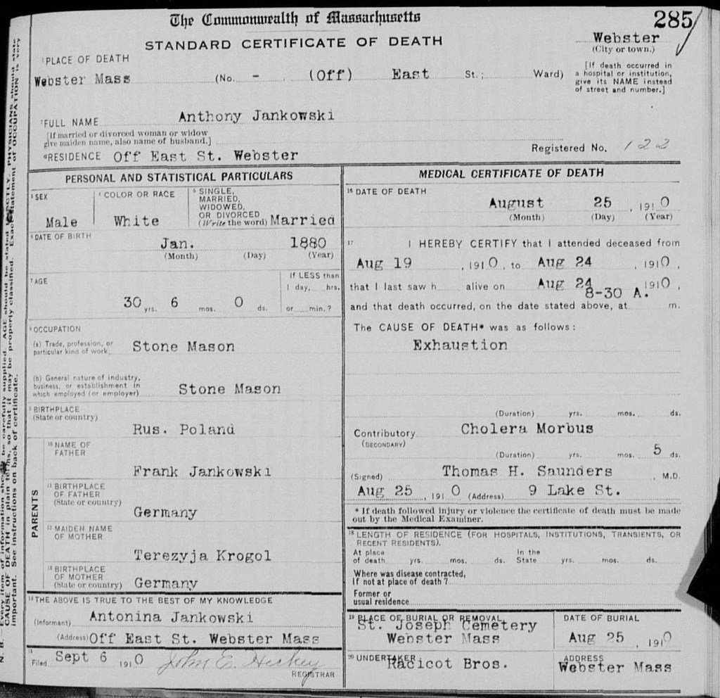 1910 Death certificate, Anthony Jankowski, Webster, Worcester, Massachusetts