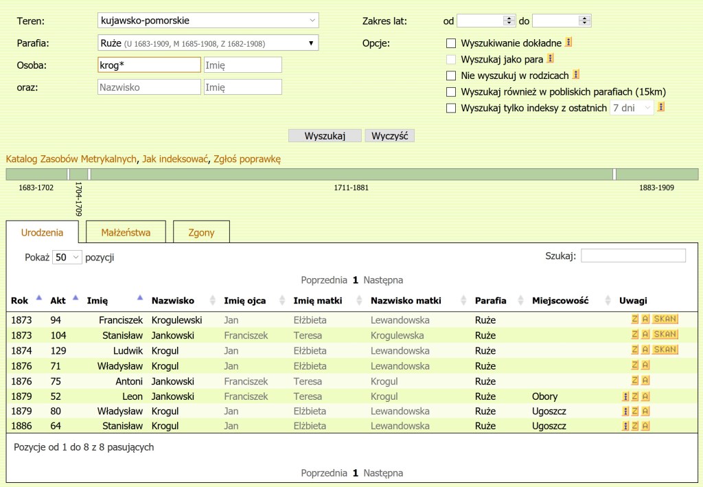 The birth records from 1882 were neither indexed nor available, and that is probably when Jan Krogul was born. The deaths of five sons of Jan Krogul and Elżbieta Lewandowska were indexed in Geneteka.