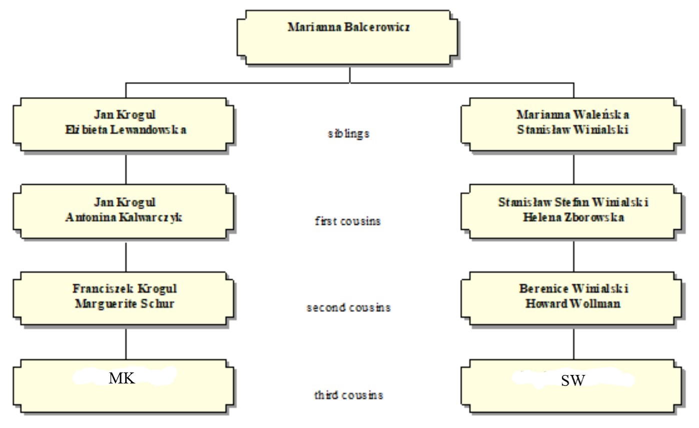 Jan Krogul and Marianna Waleńska Winialska had the same mother; their children were half first cousins. MK and SW‘s common great-great-grandmother was Marianna Balcerowicz Krogul Waleńska (1824-1895), making MK and SW half third cousins.