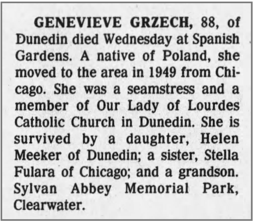 KunegundaGenevieve Grzech–died in 1993. Her obituary said that she was survived by her sister Stella Fulara [sic] in Chicago.