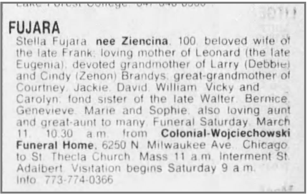 StefaniaStella Fujara–lived to be 100 years old. Her 2000 obituary mentions her late siblings Walter, Bernice, Genevieve, Marie, and Sophie.
