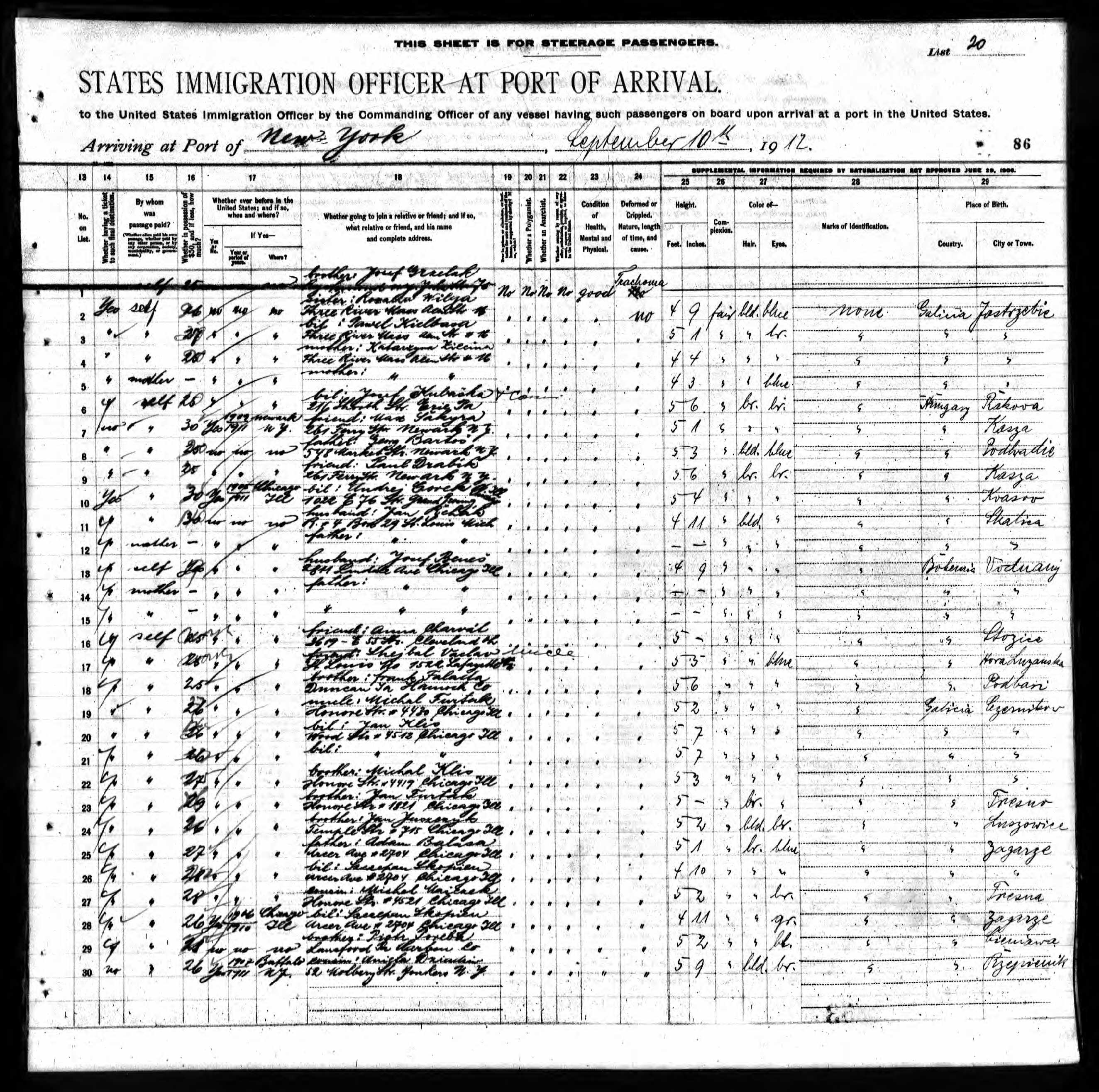 Karolina arrived in New York 2 November 1921 and was admitted to the Ellis Island hospital. Her documentation listed “Medically Certified Trachoma.” Inspectors would use their fingers or button-hooks to check immigrants’ eyes. (The idea makes me cringe.) Trachoma was one of the primary medical reasons for deportation because it was contagious, hard to treat, and often resulted in blindness. Karolina was sent back to Europe 13 Jan 1922 on the ship Hudson. Although without modern antibiotics, treatments were limited, the Ellis Island Immigrant Hospital was reportedly good. Many people, like my grandfather, recovered in the hospital and then were admitted to the United States. But Ellis Island was “Isle of Hope, Isle of Tears” for many immigrants. While almost everyone was admitted before 1914, after World War I more people were deported.