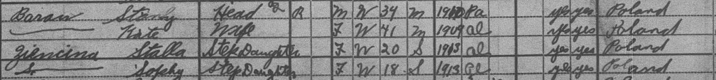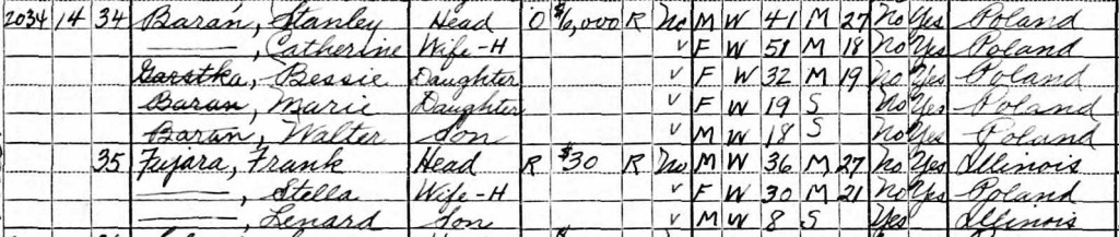 In 1930, Stanley and Catherine Baran lived at 2034 Winchester Street in Chicago, Cook, Illinois. Bronisława/Bessie had married Władysław Garstka. Stefania/Stella had married Franciszek Fujara on 29 June 1920. Zofia/Sophia had married Wincenty Ślosarczyk in Chicago on 18 Jan 1922. Kunegunda/Genevieve had married Peter Karos in Chicago on 30 July 1924.
