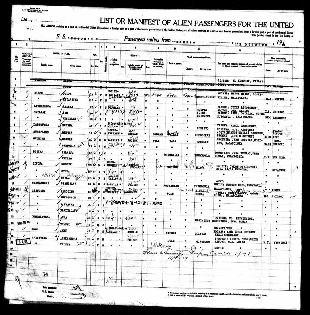 The last four children–Karolina, Kunegunda, Maryanna, and Władysław–came together to the United States. They arrived in New York 2 November 1921 on the S.S. Potomac from Danzig. Their place of birth was Kąśna Górna, Małopolska. Because of their youth, the three younger ones were held at Ellis Island as “Likely Public Charges,” but they were eventually admitted to the United States.