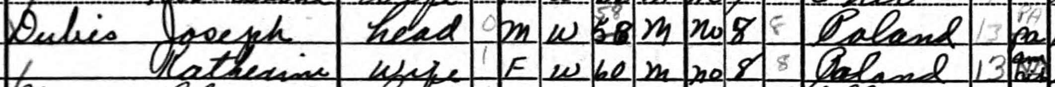 Joseph Dubis died in 1956. His wife Agnieszka/Agnes had died in 1933 in Downers Grove, but “Kathryn, nee Baron” was in his 1956 death notice. His original Polish name was Dłubisz, according to his 1940 naturalization record. The difference is subtle: https://translate.google.com/?sl=pl&tl=en&text=D%C5%82ubisz&op=translate.