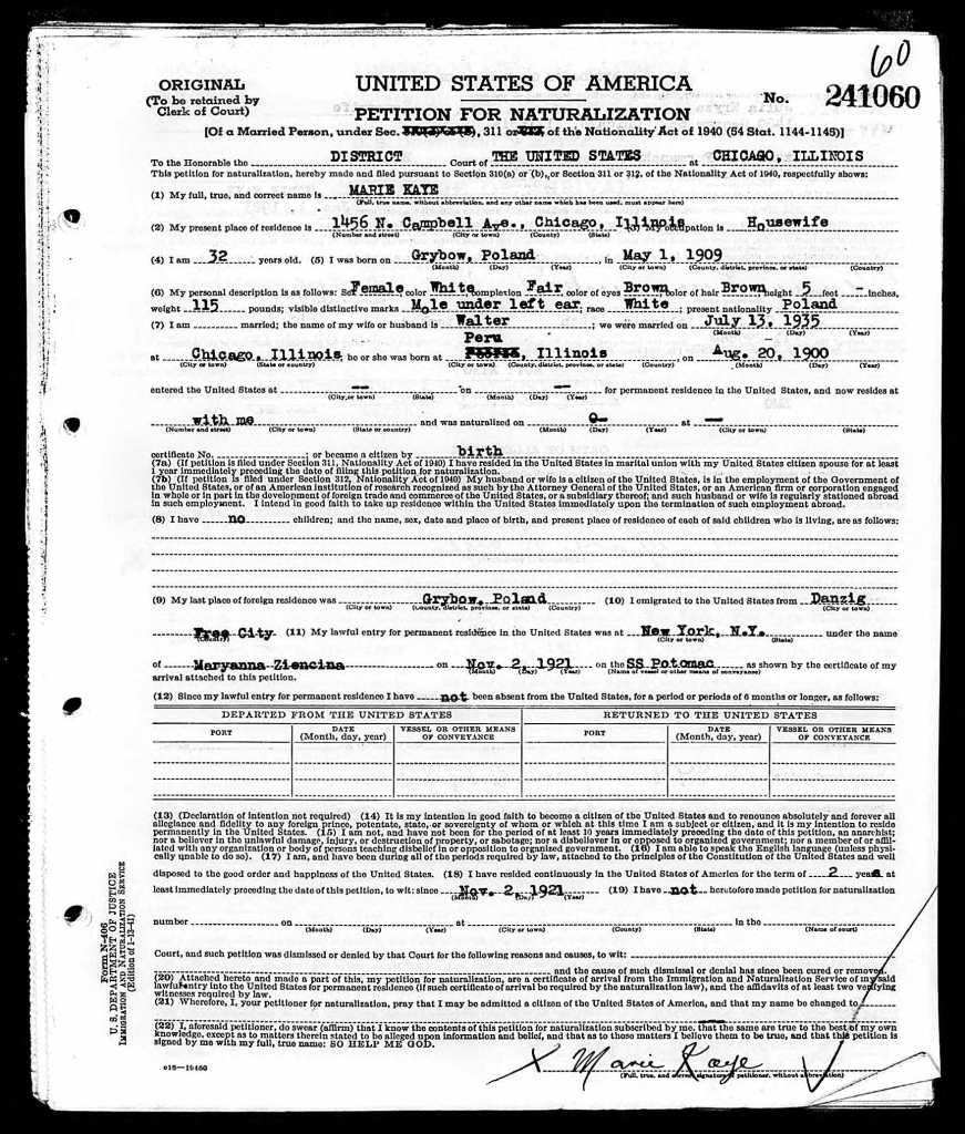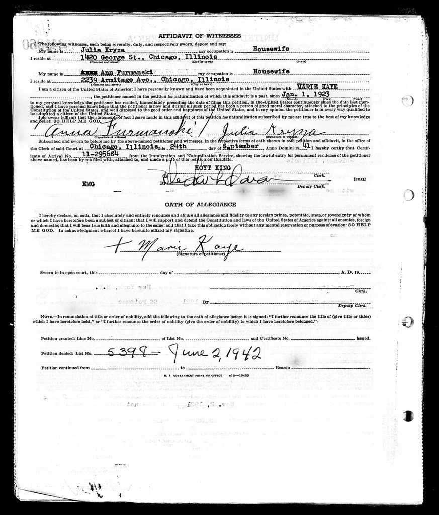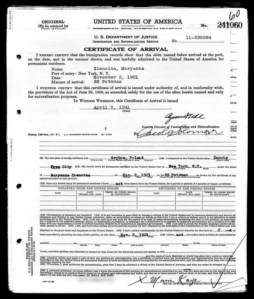 Maryanna Zięcina Baran Kozłowska Kaye obtained a Certificate of Arrival when she petitioned for naturalization in 1941. Unfortunately, she died before it was approved, and her petition for naturalization was denied on 2 June 1942.