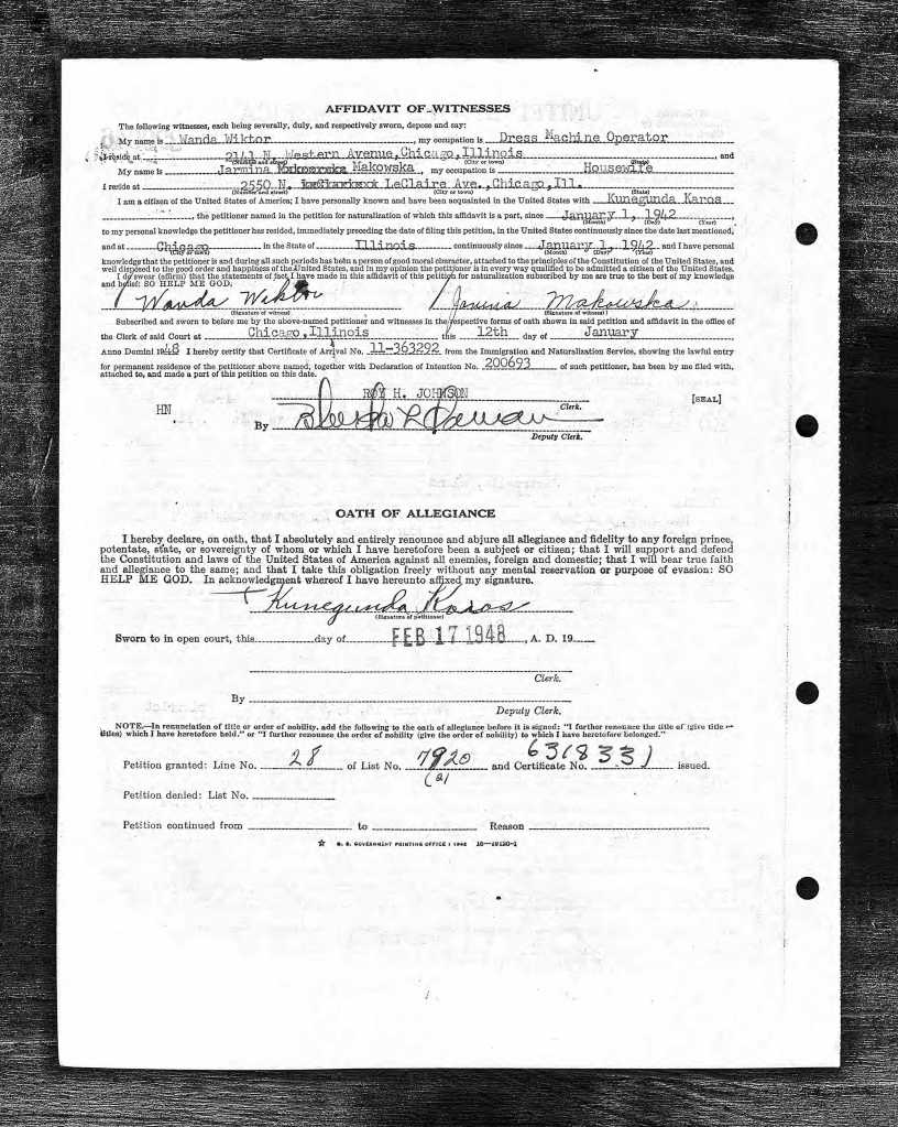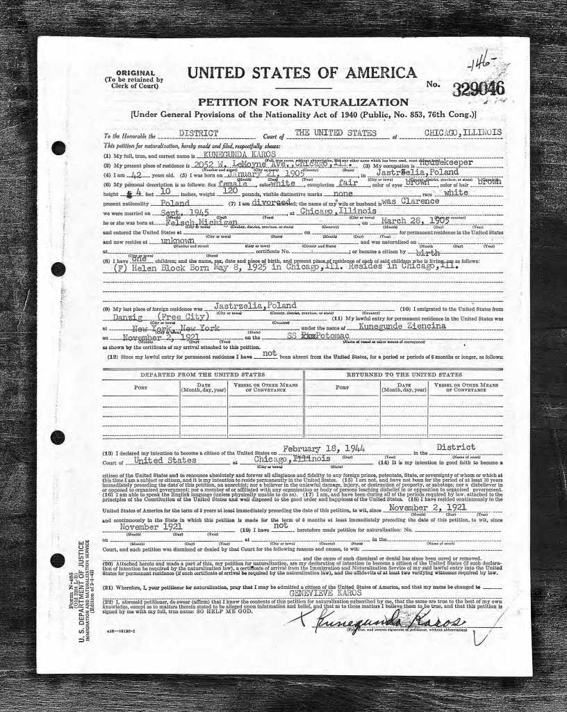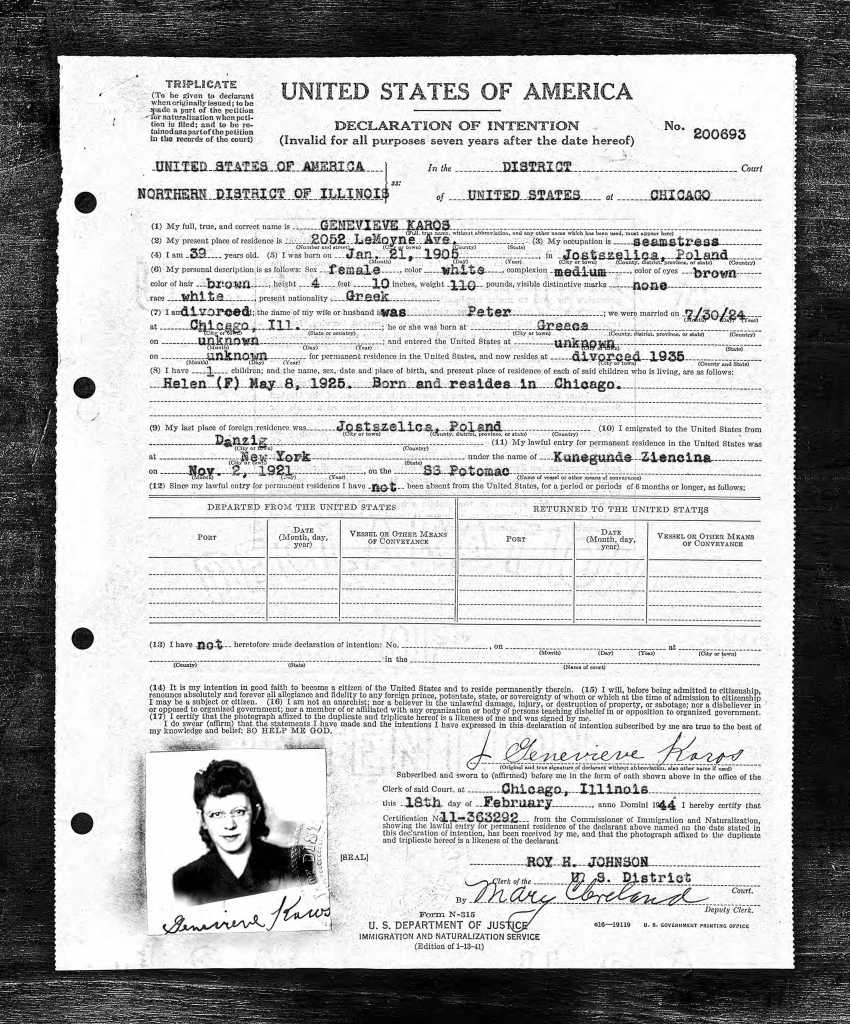 Kunegunda Zięcina Karos declared her intention to become an United States citizen 18 February 1944. She became a citizen 17 February 1948. She asked to have her name changed to Genevieve, and was known as Genewefa in Polish.