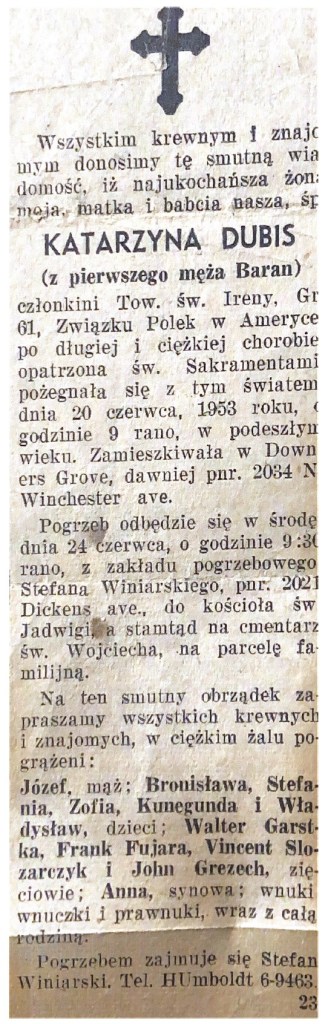 Katarzyna Dubis died 20 June 1953. Her death notice, shared by her great-granddaughter MG, was published in the Polish newspaper Dziennik Chicagoski on 22 June 1953.