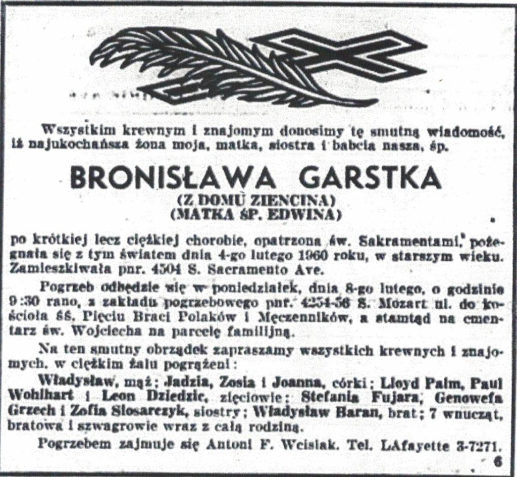 Bronisława Gartska died 4 February 1960. Her death notice was in the Polish newspaper Dziennik Chicagoski on 5 February 1960.