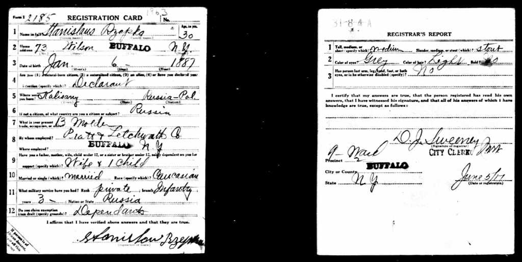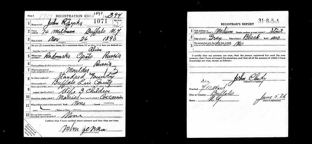 Władysław Rzepka immigrated on 2 April 1913 to New York, New York, on the ship President Grant from Hamburg, with a final destination of Buffalo, New York. On 16 November 1914, Walter Rzepka, a farmer, (fair complexion, five feet seven inches, 170 pounds, blonde hair, hazel eyes, no visible distinctive marks) declared his intention to renounce allegiance to Nicholas II, Emperor of all Russias in the US District Court in the Western District of New York.