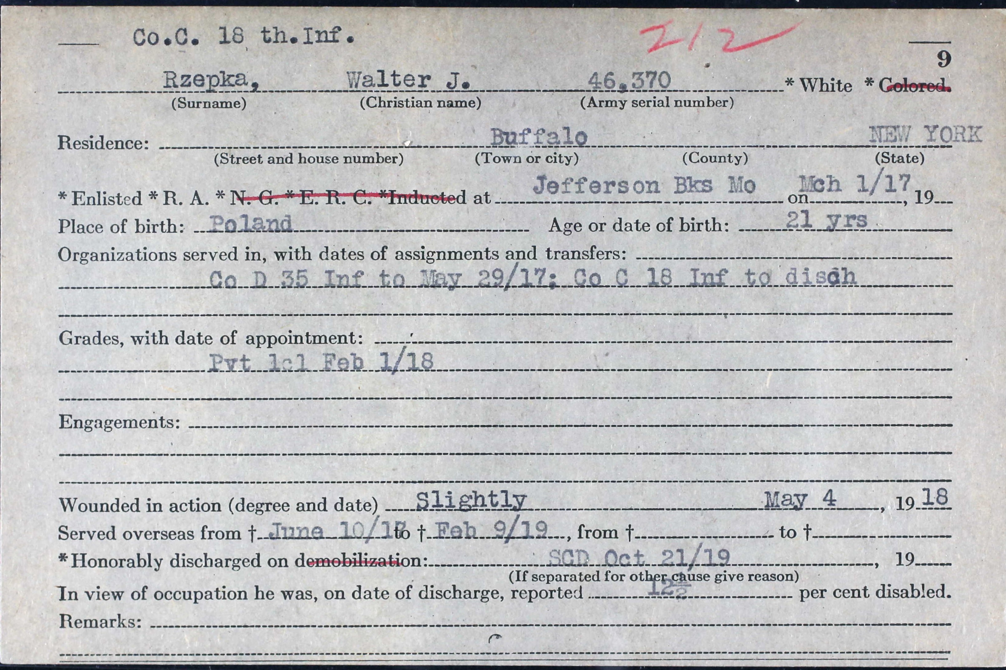 Walter J. Rzepka enlisted on 1 March 1917 in the United States Army in Buffalo, Erie, New York. He was slightly injured in Pershing’s Army 4 May 1918. Walter was discharged on 21 October 1919.
