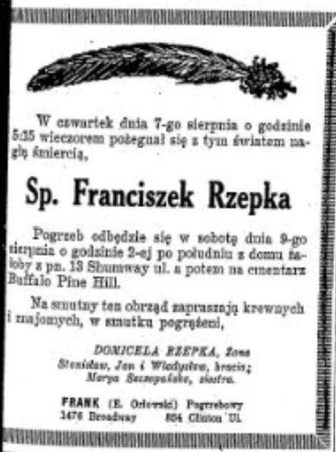 Franciszek Rzepka‘s death notice said he died suddenly, and left behind to mourn were his wife Domicela, his brothers Stanisław, Jan, and Władysław, and his sister, Marya Szczepańska.