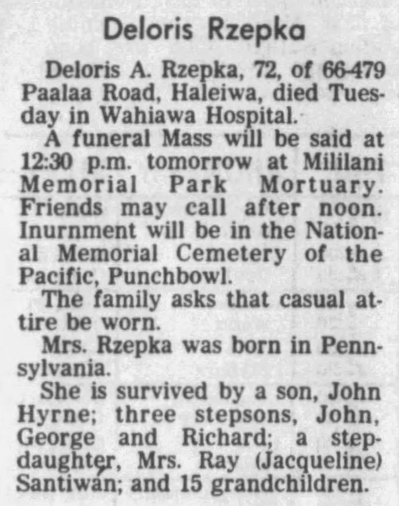 - Deloris Ann Rzepka, Honolulu Advertiser, Honolulu, Hawaii, 6 December 1984, Page 34.
