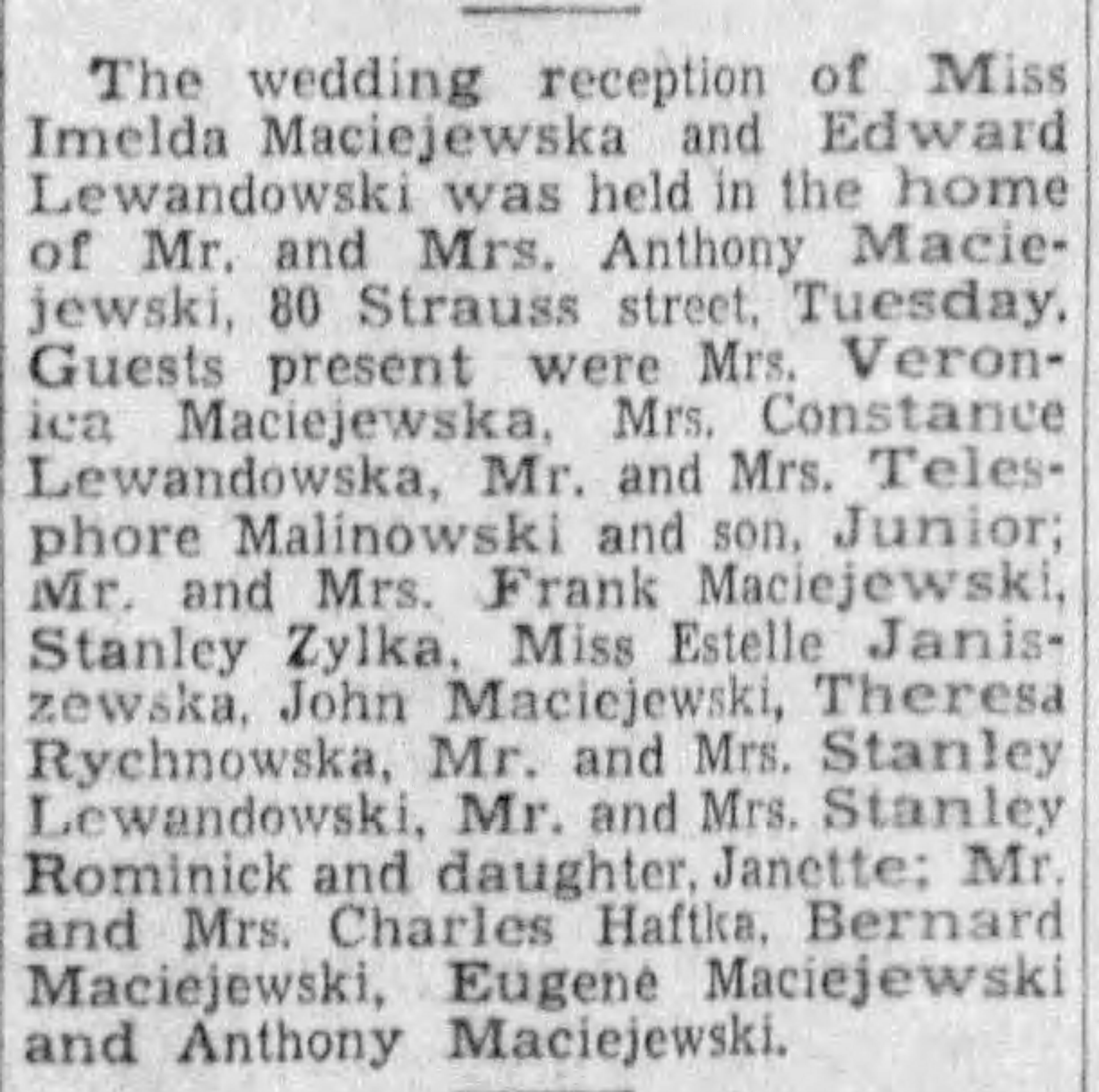 On 26 Jun 1934, Imelda Maciejewska married Edward J. Lewandowski at St. Stanislaus Roman Catholic Church in Buffalo, New York. The reception was at her parents’ house at 80 Strauss Street, and was an item in the Buffalo News on page one on Thursday, 28 June 1934.