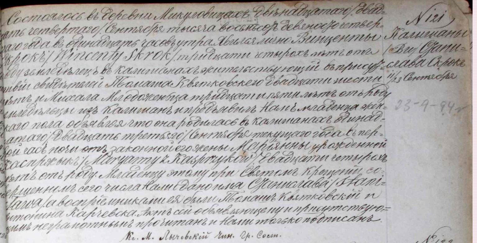 Took place in the village Mikułowice < Gmina Wojciechowice> on September 12th/24th, 1894 at 11 o’clock in the morning. Appeared Wincenty Skrok, farmer, 34 years old, living in the village Kaliszany <Gmina Wojciechowice>, and in the presence of witnesses Tomasz Kwiatkowski 26 years old, and Michał Młodożeniec, 35 years old, both farmers living in the village Kaliszany, he presented to Us a child of female sex, stated that this child was born in the village Kaliszany on September 11th/23rd of current year at 1 o’clock in the night to his lawful wife Marianna nee Kasprzyk, 24 years old. At the Holy baptism performed on this day by priest Lyczewski this child was given the name Stanisława, and her godparents were 1st witness and Antonina Karczewska. This document was read aloud to the illiterate present and signed only by Us.