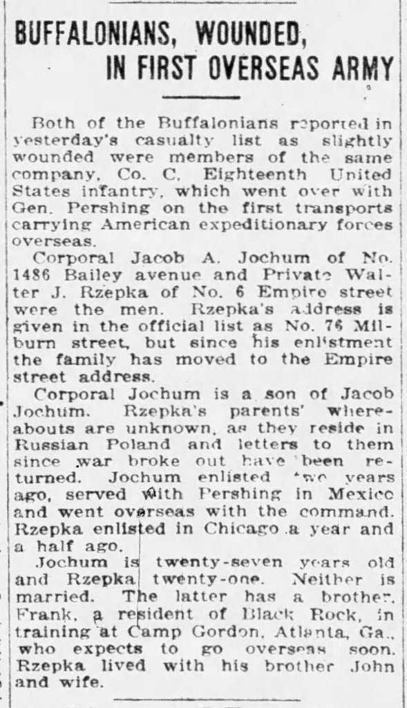 Walter Rzepka was one of the United States casualties of the war. Slightly wounded, this Buffalo Courier article reported that “Rzepka’s family whereabouts are unknown, as they reside in Russian Poland and letters to them since war broke out have been returned.”