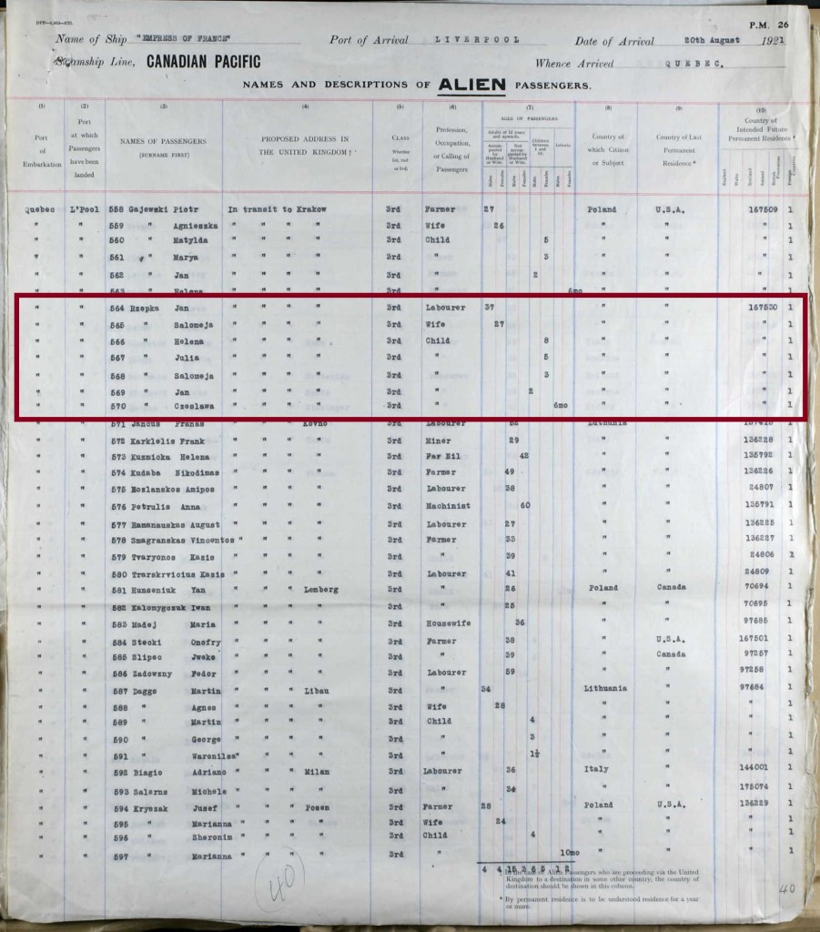 Czesława “Leona” Rzepka, the youngest daughter of Jan Rzepka and Salomea Zielińska was born in Buffalo 22 March 1921, so she was a baby when her family returned to Poland. They traveled on the ship Empress of France, traveling from Quebec to Liverpool, and arriving 20 August 1921.