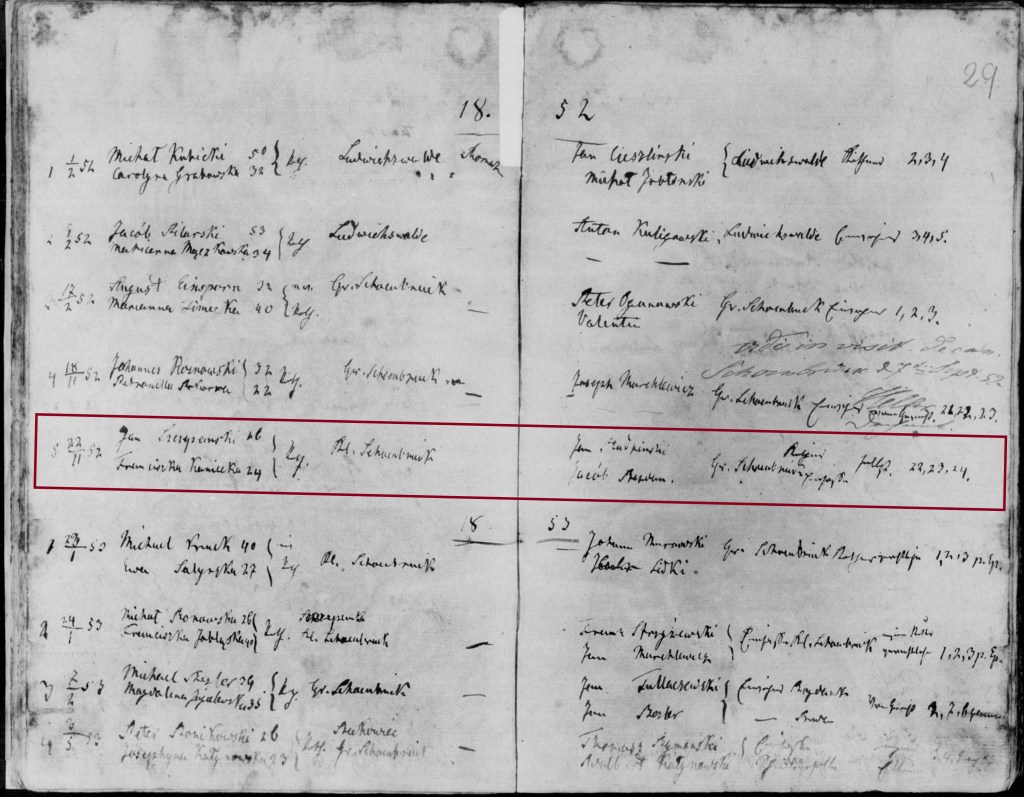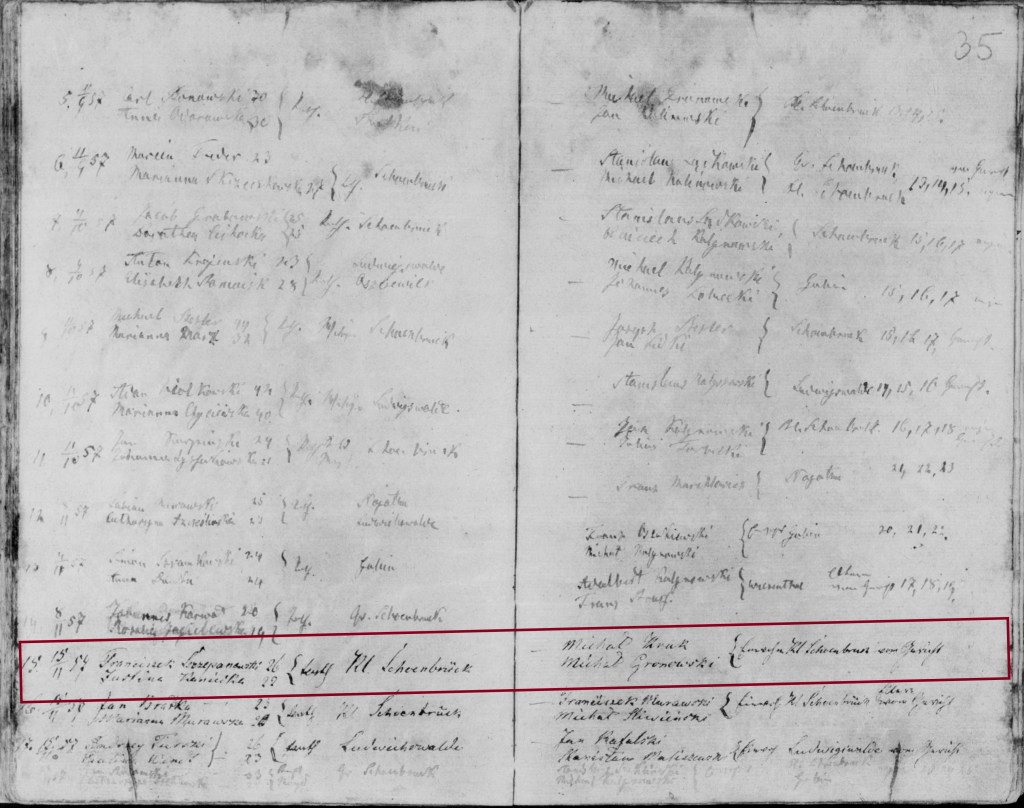My great-great-grandparents Jan Szczepański and Franciszka Kaniecka were married in Groß Schönbrück on 22 Nov 1852, when he was 26 years old and she was 22 years old. They were from Klein Schönbrück. The witnesses were Jan Studzinski and Jakób Szczdun.
