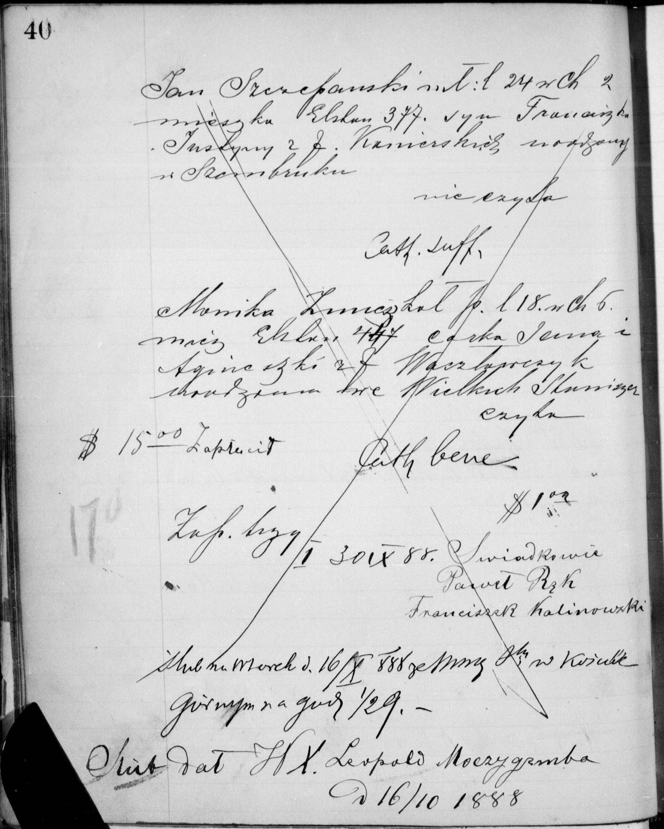 Jan Szczepański married Monika Śmieszkoł at St. Stanislaus Kostka Church in Chicago 16 Oct 1888. He was młodzieniec, a young man, 24 years old, in Chicago two years, living at 377 Elston Street. He was the son (syn) of Franciszek and Justyna Kaniecka, and was born (urodzony) in Szombruk.