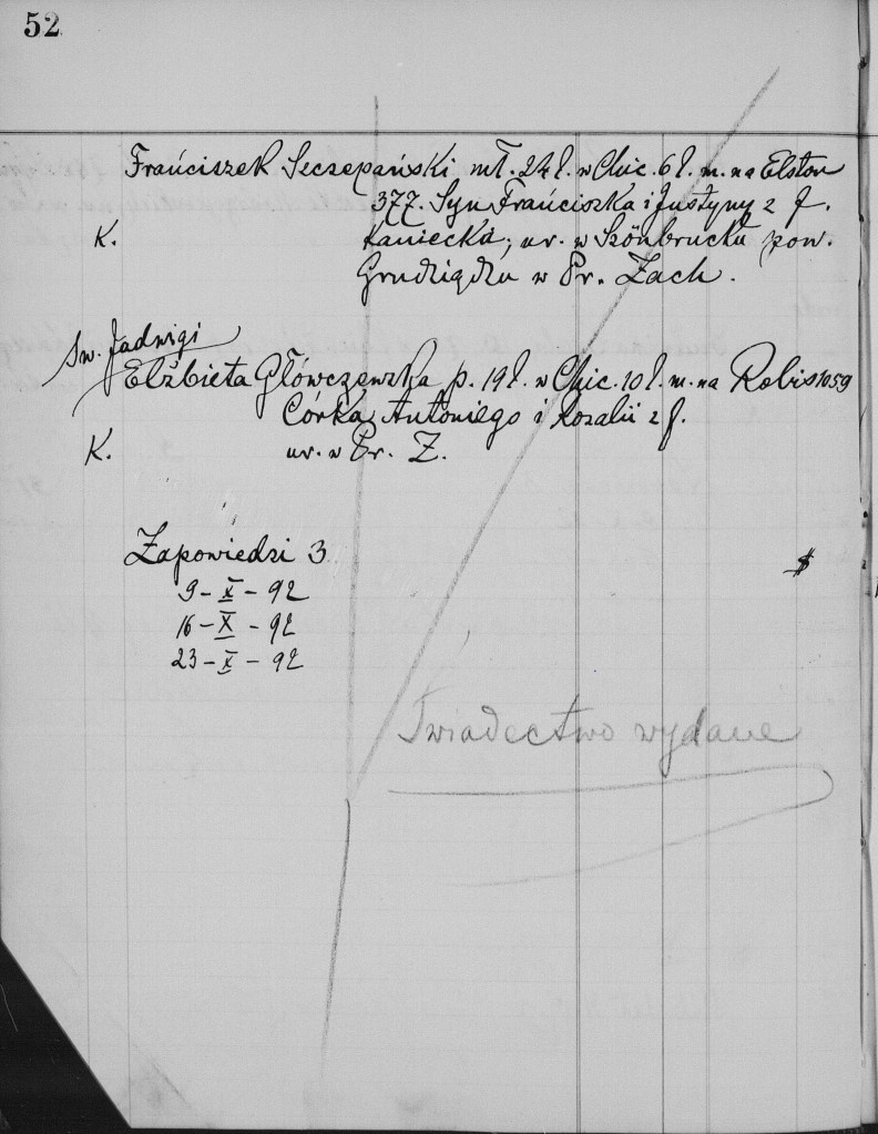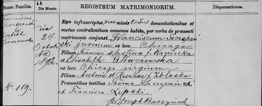 After the banns were read on October 9, 16, and 23rd, a certificate was issued, and the marriage took place at St. Hedwig Church on 24 October 1892. Elżbieta‘s mother’s name was Rozalia Zble[w]ska.