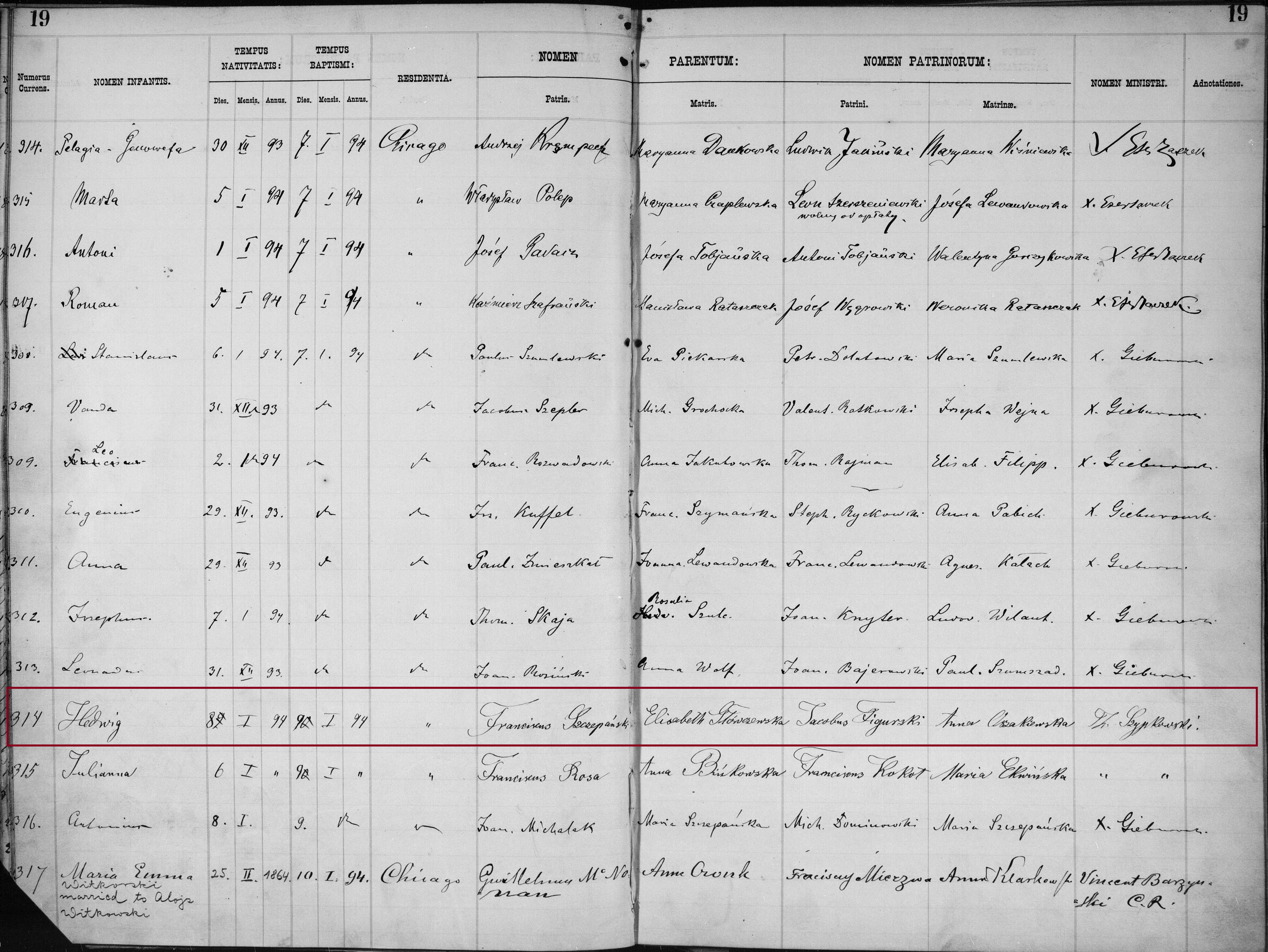- St. Stanislaus Kostka RC Church, Chicago, Illinois, Baptisms 1893-1900, page 19, number 314.