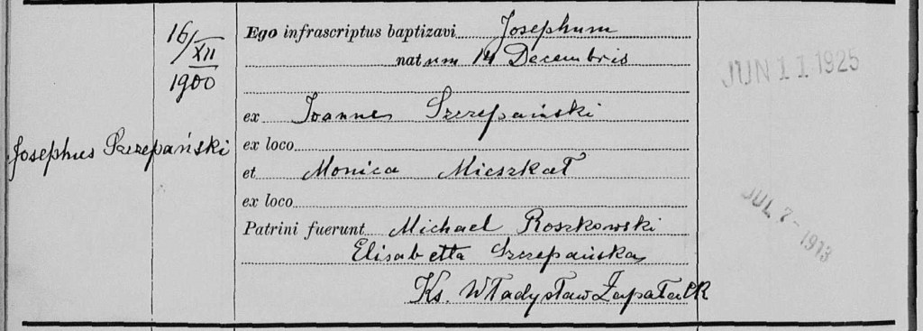 Jan Szczepański and Monika Śmieszkoł‘s son Józef Szczepański was born 14 Dec 1900 and baptized 16 Dec 1900 at St. Stanislaus Kostka Church in Chicago, Illinois.