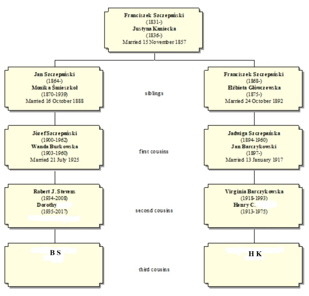 In 2021, I matched DNA on 23andMe with HK and JK, with 28 centiMorgans in common with each of them. HK identified one of his ancestors as John Barch, an Americanized version of Jan Barczykowski. Several descendants of my great grandparents Marcin Szczepański and Anna Kalinowska were identified as our relatives in common. How were we related?
