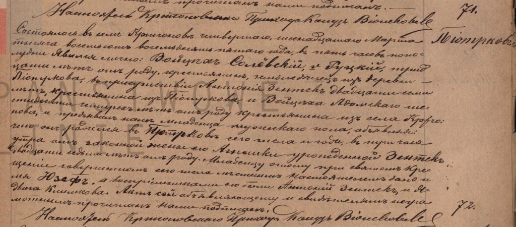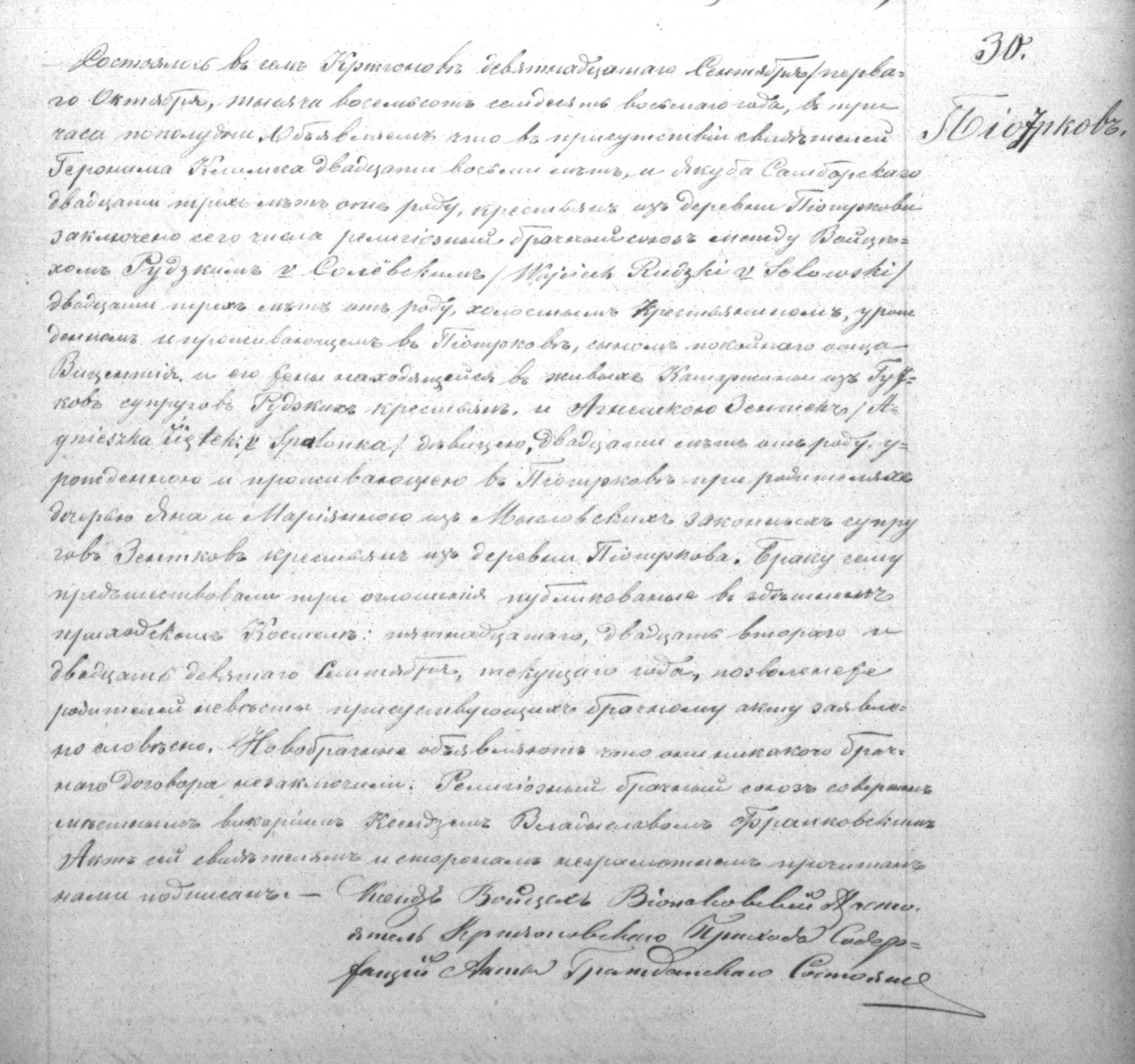 Took place in the village of Krzczonów on 19 September/1 October 1878 at 3 o’clock in the afternoon. We announce that in the presence of the witnesses Hieronim Klimek, age 28, and Jacób Samborski, age 23, both peasants, residing in the village of Piotrkówek, today a religious marital union was concluded between Wojciech Rudzki aka Solowski, bachelor, peasant, 23 years old, son of Wincenty, already deceased, and still living Katarzyna, née Gutek, the spouses Rudzki, peasants, born and residing in the village of Piotrkówek, and Agnieszka Ziętek aka Spolonka, a maiden, 20 years old, born and residing with parents in the village of Piotrkówek, daughter of Jan and Marianna, née Mysłowska, the spouses Ziętek. This wedding was preceded by three announcements of the banns in the local parish church of the village Krzczonów on 15,22,29 September of the current year. The newlyweds stated they did not conclude a prenuptial agreement. Permission for the wedding was given to the bride by her parents, who were present at the wedding ceremony, verbally. The religious wedding ceremony was performed by priest, vicar of this parish, Władysław Fralkowski. This act was read aloud to the illiterate people present and signed by Us only, administrar, abbot of this parish , keeper of civil registry.