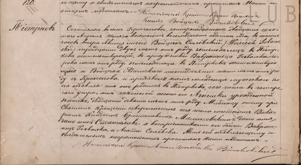 Took place in the village of Krzczonów on 14/26 April 1887 at 6 o’clock in the afternoon. Appeared in person Wojciech Solowski, peasant, 32 years old, residing in the village of Piotrków, and in the presence of the witnesses Wawrzyniec Rozwalka, peasant, age 40, residing in Piotrków, and Wojciech Adamski, age 65, residing in Krzczonów, he presented to Us a child of male sex stating that this child was born in the village of Piotrków today at 4 o’clock in the morning to his lawful wife Agnieszka, née Ziętek, 29 years old. At the Holy baptism performed on this day by priest Bronisław Malinowski this child was given the name Stanislaw and his godparents were Wawrzyniec Rozwałka and Agata Solowska. This act was read aloud to the illiterate people present and signed only by Us.