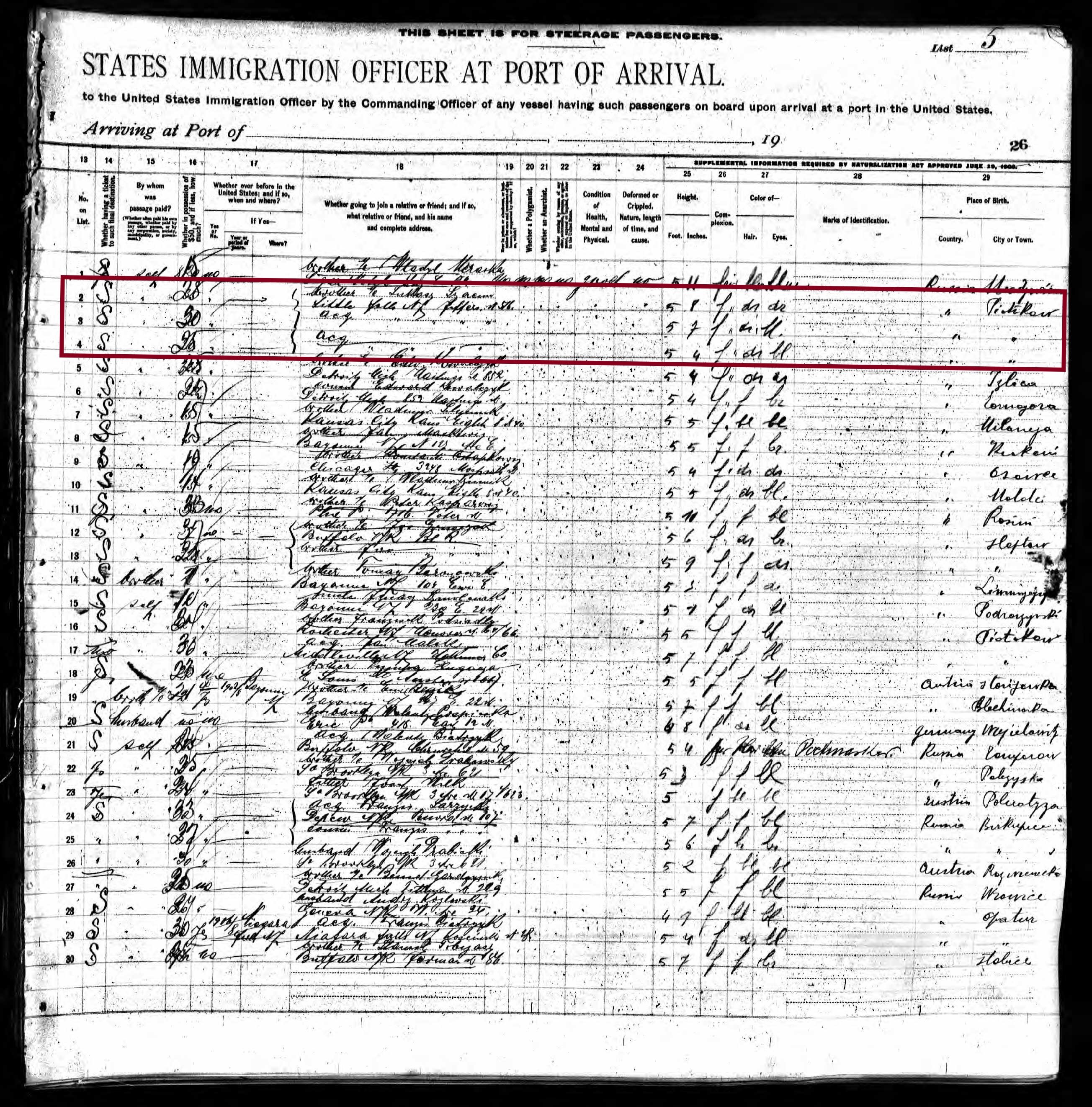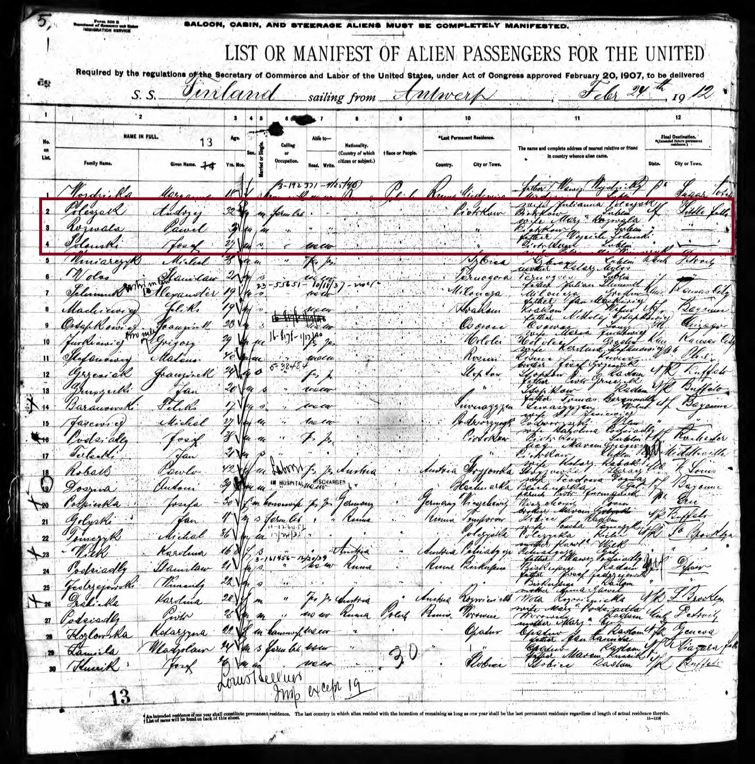 Twenty-seven year old Józef Solowski arrived in New York 6 March 1912 on the ship Finland with two others from the village of Piotrków: Andrzej Poleszak and Paweł Rozwala.