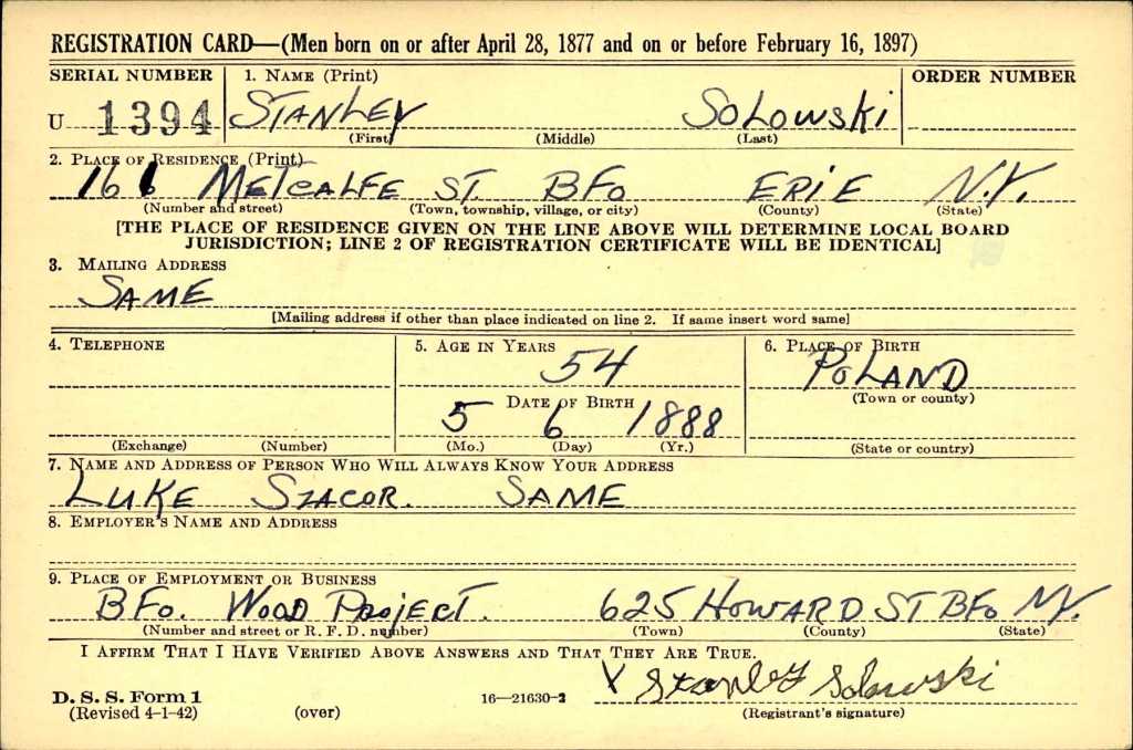 When Stanley Solowski registered for the WWII draft, he identified Luke Szacor at 161 Metcalfe Street in Buffalo as the person who would always know his address.