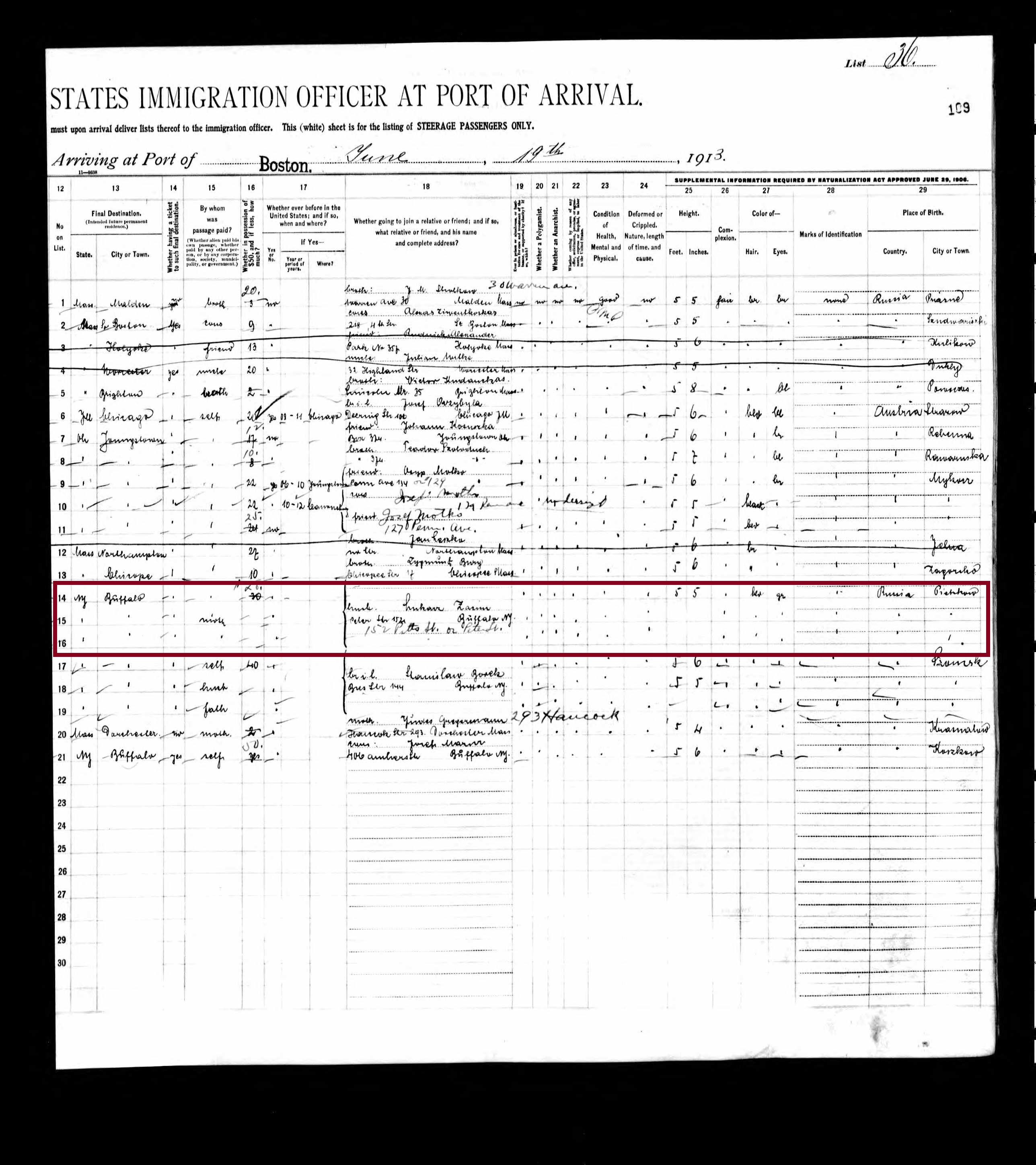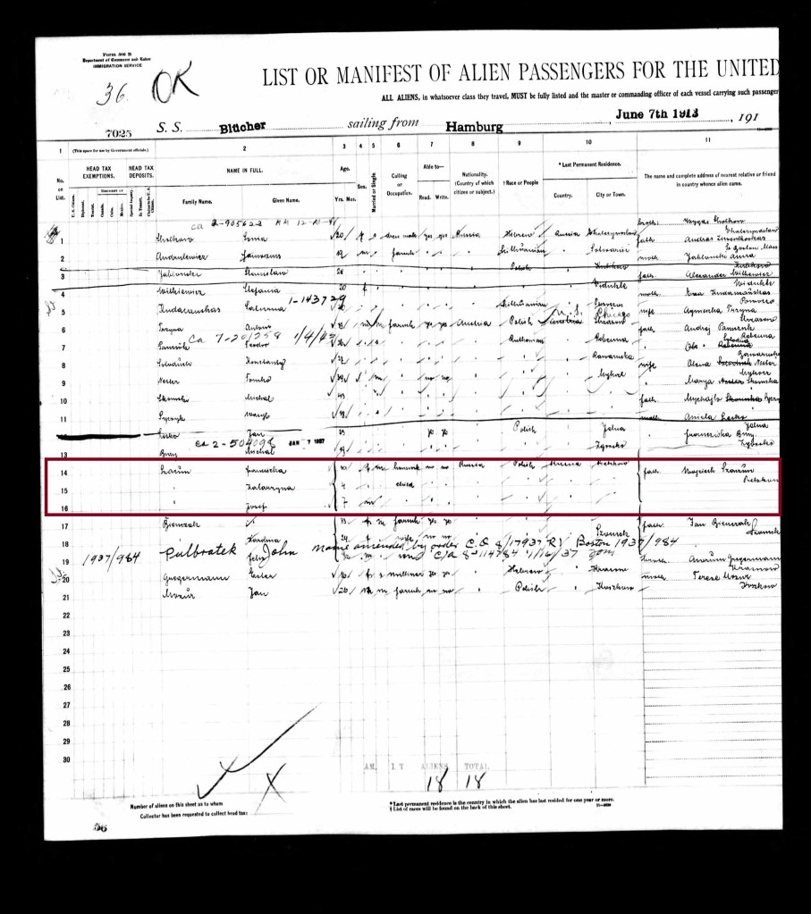 Łukasz Szacoń‘s wife Franciszka arrived in Boston on the ship Blücher on 19 June 1913 with their children Józef and Katarzyna.