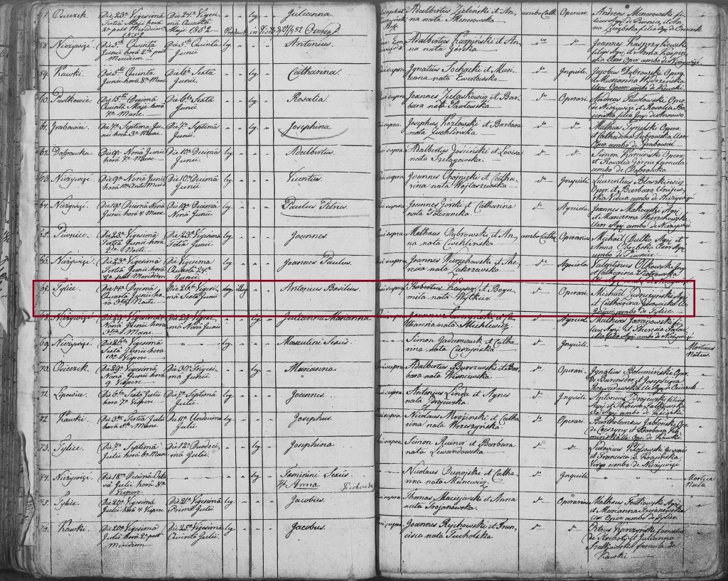 I found Anton‘s birth in the Nieżywięć records. Antonius Basilius (in Polish, Antoni Bazyli) was born to unmarried parents on 14 Jun 1852 in Tylice.