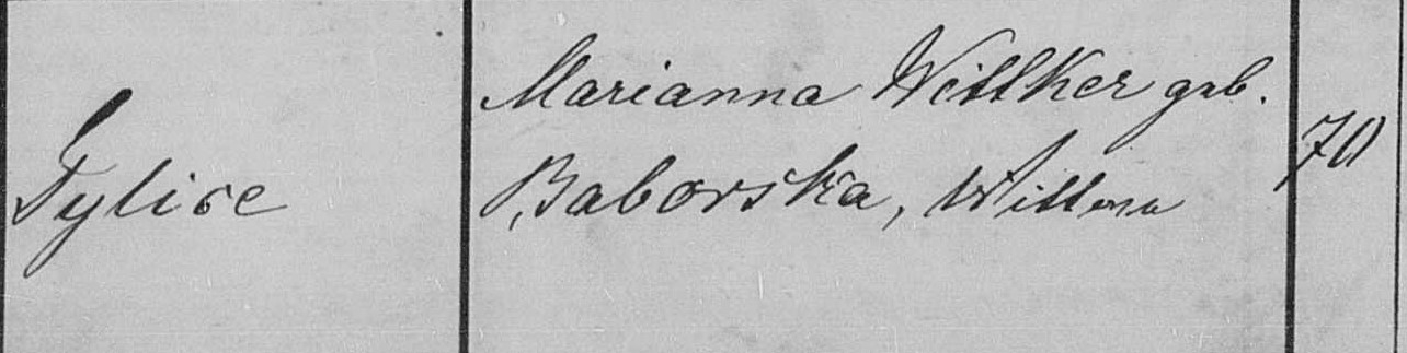 Gottliebe/Bogumiła‘s mother Marianna Wittker, geboren Baborska, widow (Wittwe), aged 70, died in Tillitz on 8 November 1862. She was buried 11 November 1862.