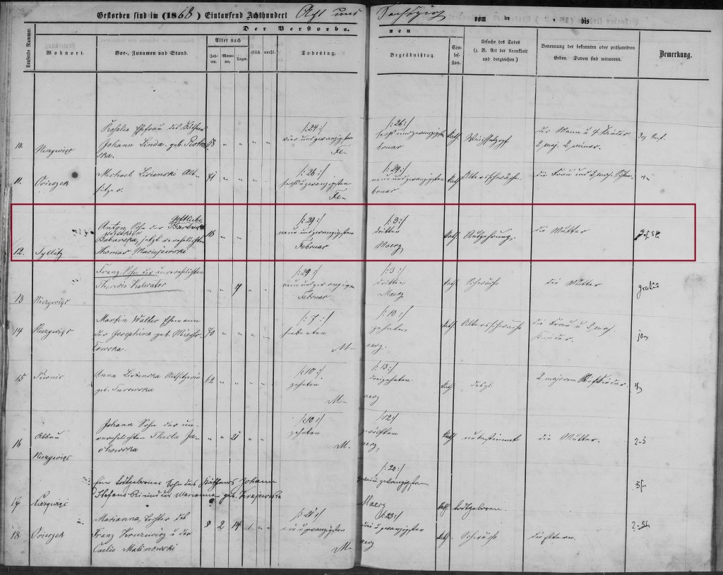 On 29 Feb 1868, her son Anton died in Tylice in his 16th year. He was buried on 4 Mar 1868 in Nieżywięć/Niezywienc. The cause of death was “Auszehrung,” consumption (tuberculosis) or a wasting disease with emaciation or debility.