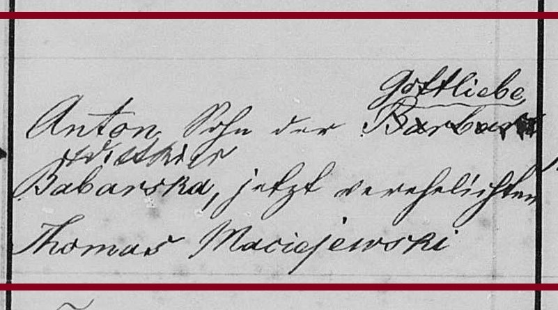 Anton was the son of Gottliebe (Wittkier is crossed out) Babarska, now married to Thomas Maciejewski.
