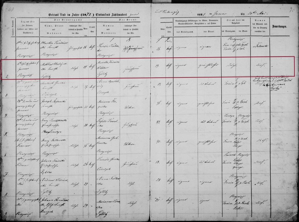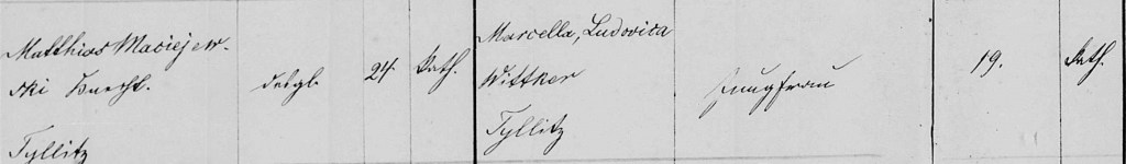 On 15 Jan 1872, Marcella Ludwica Wittker and Matthias Maciejewski, both of Tillitz, were married in Niezywienc, Strasburg, Westpreußen, Preußen.