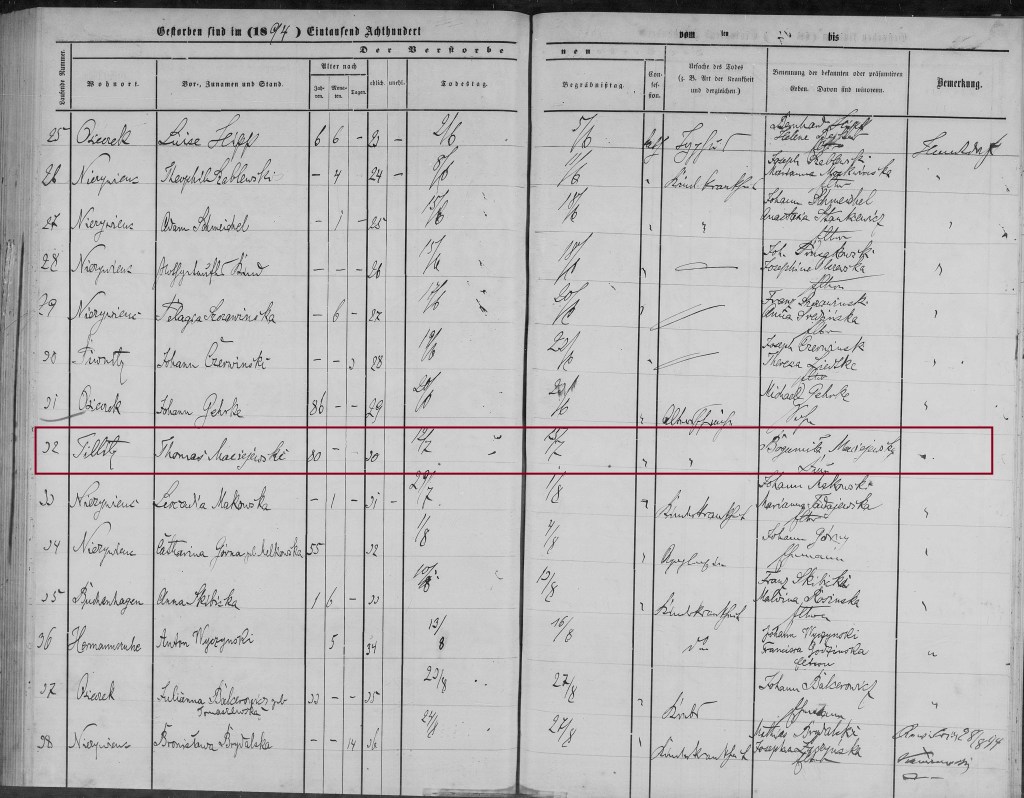 Bogumiła Maciejewska was listed as the widow of Tomasz/Thomas Maciejewski at his death in Tillitz on 12 Jul 1894.