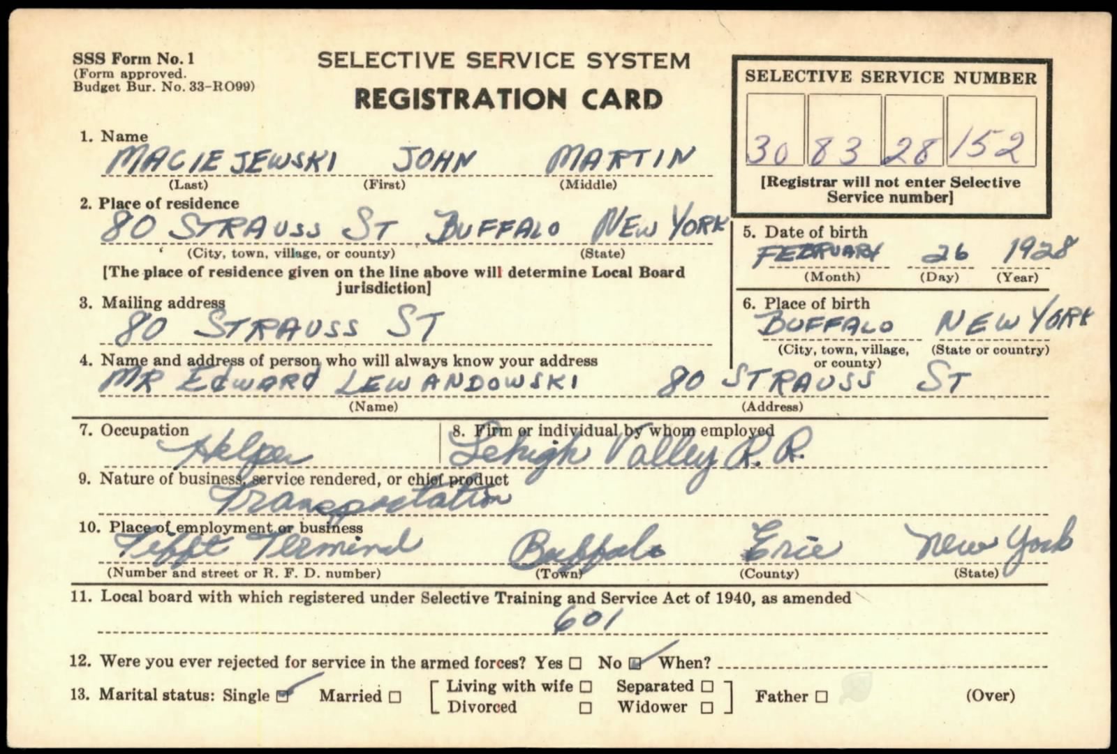 - New York State, Department of Health, Vital Records Index, Cert. No. 10338 Buffalo, John M. Maciejewski, 26 February 1928, Albany, New York.