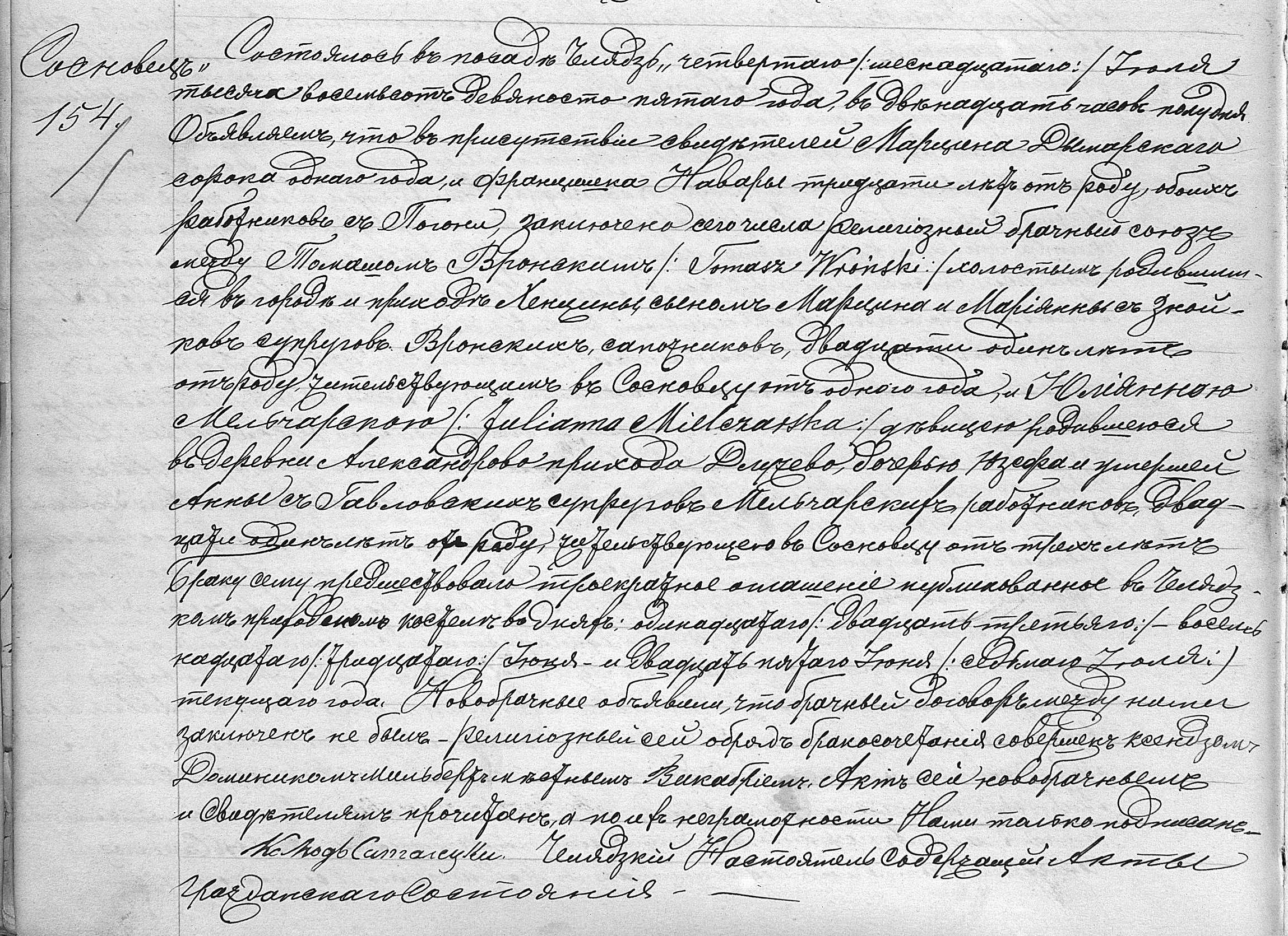 Took place in the village of Czeladź on 4/16 July 1895 at noon. We announcing that in the presence of the witnesses Marcin Dymarski, age 41, and Franciszek Nawara, age 30,workers, living in the village of Pogonie?,on this day a religious marital union was concluded between Tomasz Wroński, a bachelor, a shoemaker, 21 years old,born in the village of Chęciny and living in the village of Sosnowiec, son of Marcin and Marianna, née Znojek,the spouses Wroński, and Julianna Mielczarska, a maiden, 21 years old, born in the village of Aleksandrów of Sluzewo parish and living in the village of Sosnowiec, daughter of Józef and his late wife Anna, née Gawlowska, the spouses Mielczarski.This wedding was preceded by three announcements of the banns published in the parish church of Czeladź on 11/23,18/30 June and 25 June/7 July of the current year.The newlyweds stated that a prenuptial agreement has not been concluded between them.This act was read aloud to illiterate people present and signed by Us only.