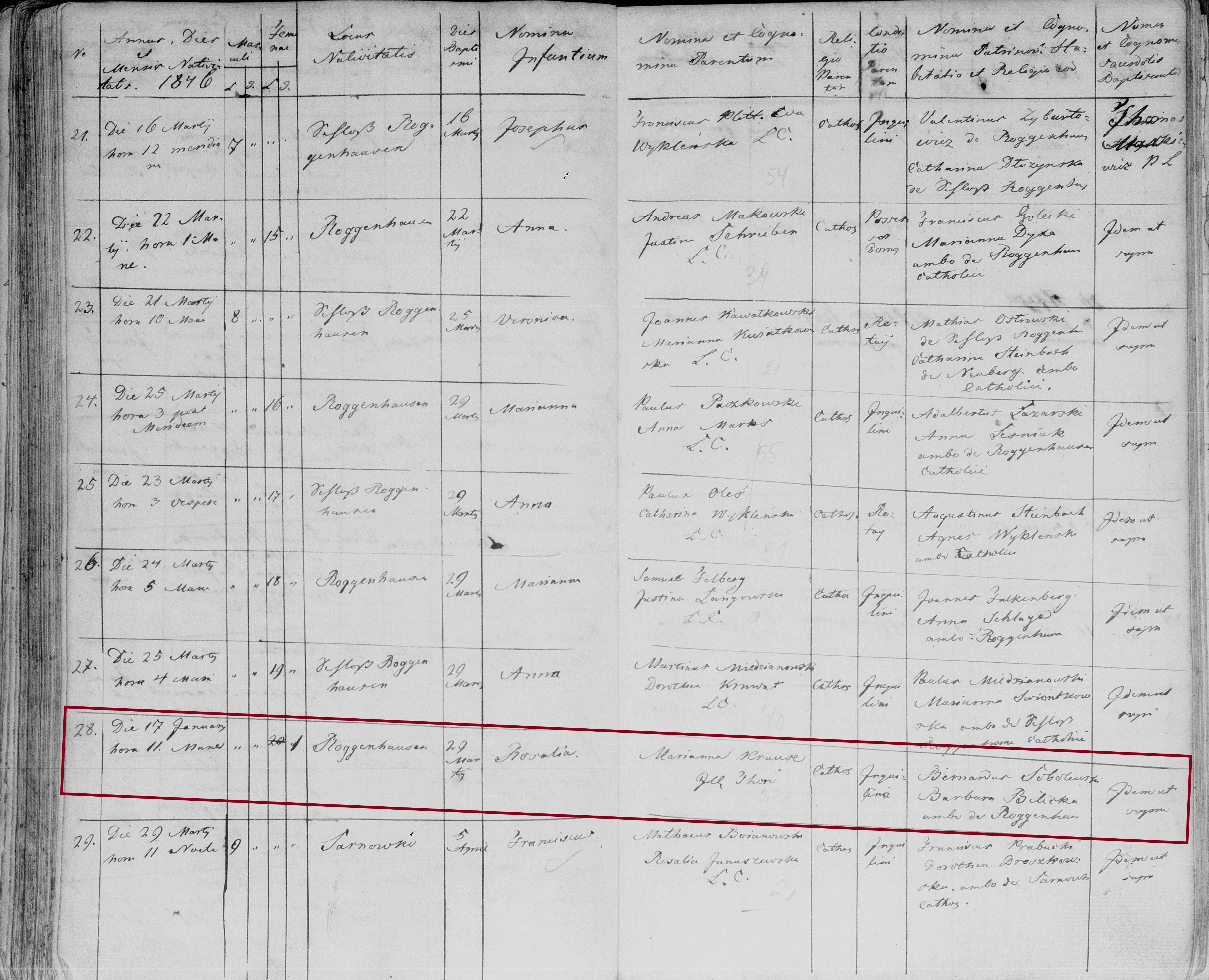- LDS Family History Library, “Roggenhausen (Graudenz),” database, Kościół rzymsko-katolicki. Parafja, Family Search (familysearch.com: accessed March 2018), Rozalia Krause; citing Germany, Preußen, Westpreußen, Roggenhausen – Church records. https://www.familysearch.org/ark:/61903/3:1:3Q9M-CSZL-DF18?i=469&cat=307697