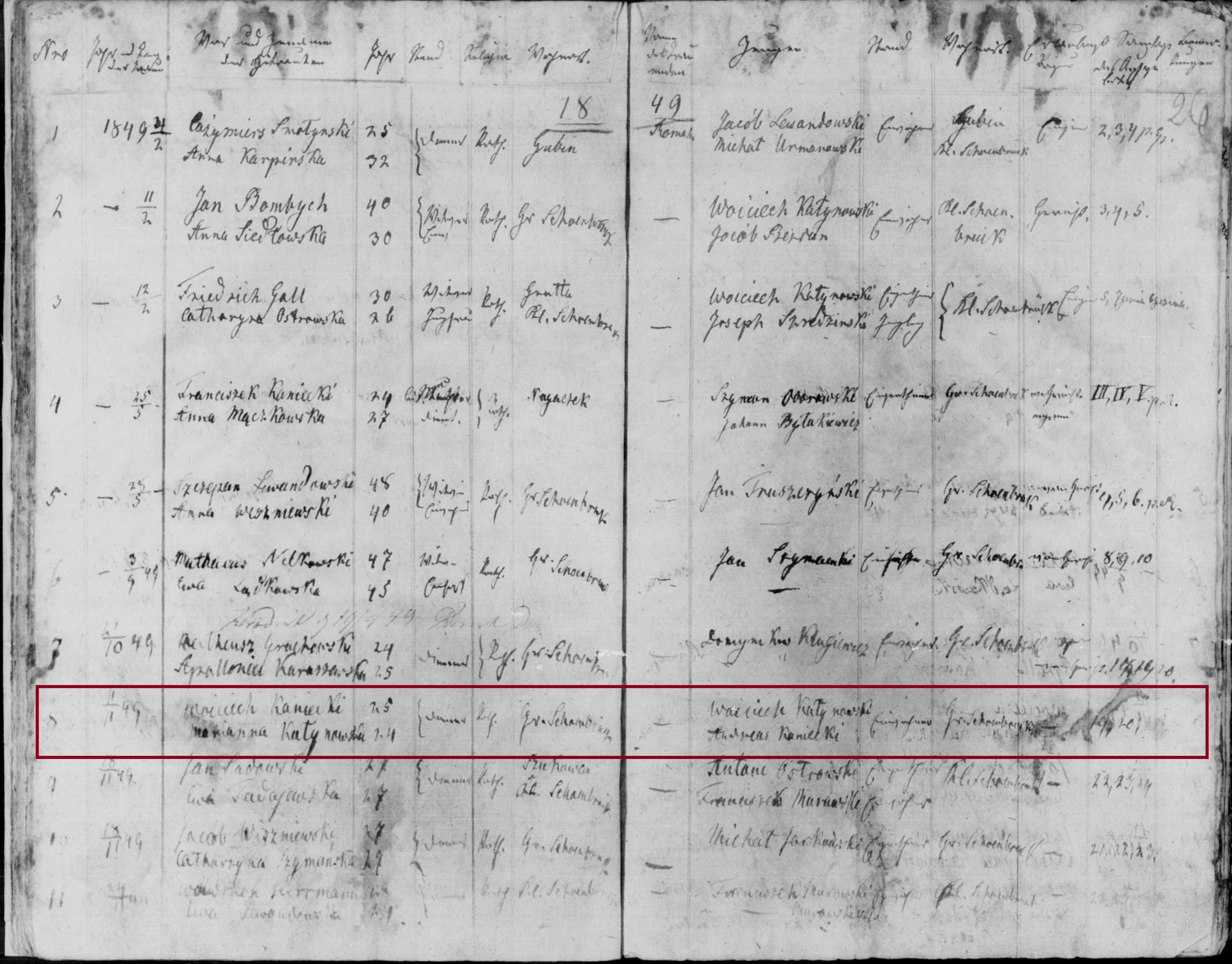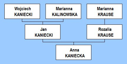 Wojciech Kaniecki and Marianna Kałynowska were married 11 November 1849 in Groß Schönbrück/Szembruk, West Prussia. Wojciech was 25 years old, so he would have been born about 1824. Marianna was 24 years old, so she would have been born about 1825. Witnesses were Wojciech Kałynowski and Andreas (Andrzej in Polish) Kaniecki.