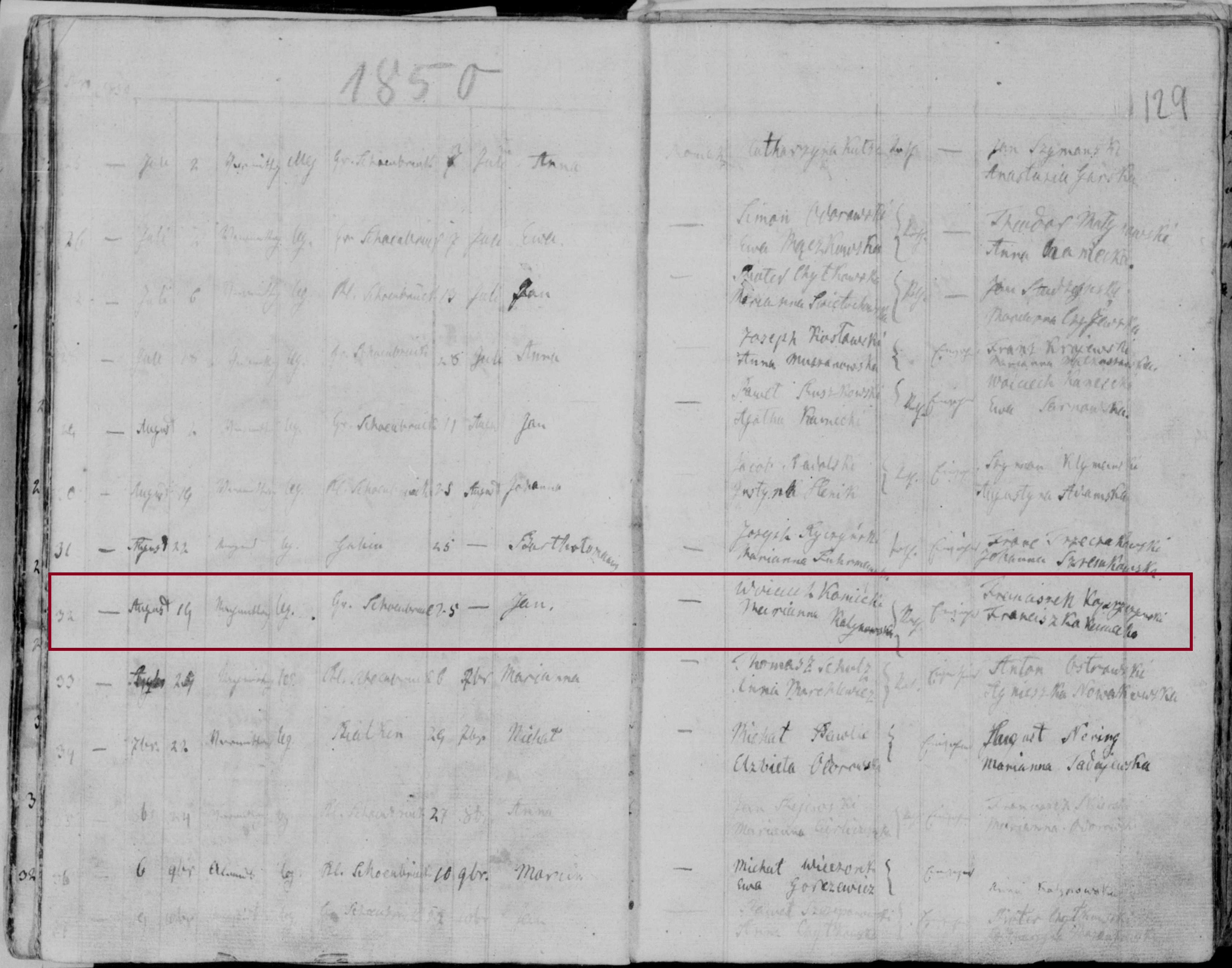 Jan Kaniecki was born 16 Aug 1850 and baptized 16 Aug 1850 in Groß Schönbrück/Szembruk. His parents were Wojciech Kaniecki and Marianna Kalynowska.