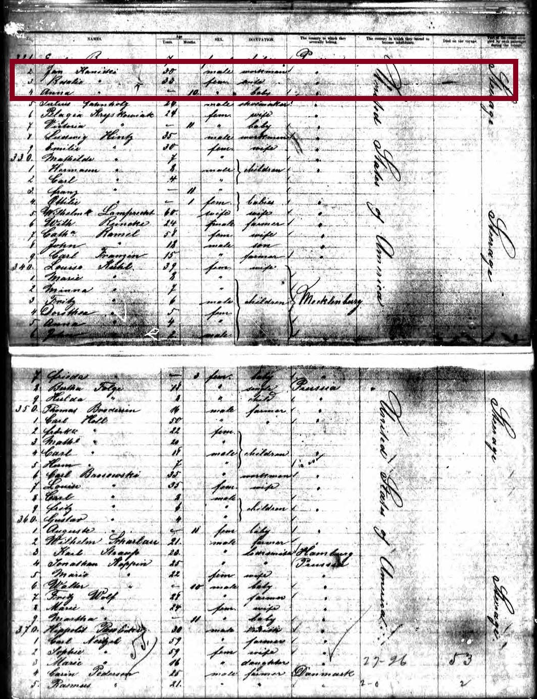 Jan, Rozalia, and Anna Kaniecki emigrated on 9 Apr 1882 from Hamburg, Germany, on the German ship Rhenania of the Hamburg-Amerikanische Packetfahrt-Actien-Gesellschaft (HAPAG) Hamburg America Line. The German record listed Jan‘s occupation as arbeiter (worker), and his age as 30. His wife Rosalie was 33, and their daughter Anna was 10 months old.