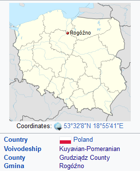 - Wikipedia contributors. (2017, June 29). Rogóźno, Kuyavian-Pomeranian Voivodeship. In Wikipedia, The Free Encyclopedia. Retrieved 14:01, March 17, 2019, from https://en.wikipedia.org/w/index.php?title=Rog%C3%B3%C5%BAno,_Kuyavian-Pomeranian_Voivodeship&oldid=788143812